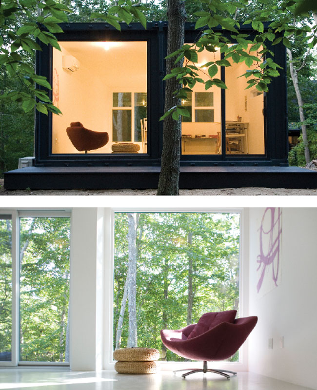 For artist Andrea Shapiro, catching the perfect wave was an initial draw to the Hamptons, as well as being part of an exceptional art community. An avid surfer, she bought a house not far from the ocean in Amagansett and rented a series of seven art studios without finding something more permanent. She finally consulted architect Maziar Behrooz, who had done a renovation of her house, about building a studio on her property. “We came up with the idea of a shipping container,” Shapiro says, “which is both a great, sustainable way of reusing something and less expensive than building a studio from scratch.” A winding path now leads to a two-level artist’s studio with 20-foot-high ceilings, built in 2009 with two eight-by-40-foot shipping containers. “I knew Andrea’s taste went beyond the conventional when we worked on the renovation of her house a year earlier,” says Behrooz. “We wanted to explore something different, and the boxy nature of the containers lends itself to studio space. When we finished, the pictures of the studio went viral on the web, and I had so many inquiries that I decided to develop a way to pre-fab them in a factory setting.”