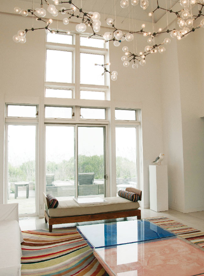 “The building’s façade used to be just the wall you passed before you got to the village, but now that it has windows and transparency, it has come to life—you can really see it as part of Sag Harbor again,” says Gambrel, sitting in a third-floor model apartment with 28 windows and views down the harbor. (The fivestory structure, which was given a $40 million restoration, boasts nearly 1,000 windows in all.) “Watchcase came with so many great elements: There are the brick walls, which have a lot of weight and structure, and wooden beams riddled with history. And then the huge windows. It was our job to find materials that would warrant the weight, yet keep it fresh and light.”
