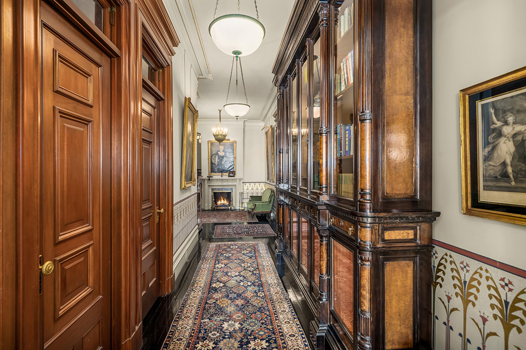 Enter the 21-foot grand entry gallery and begin to take in the 4,500-square-feet of splendor. A dramatic 27’ corner living room with magnificent ash black floors and mahogany details leads to an the adjacent gracious dining room, with 11′ pocket door, gold leafed ceiling, additional wood-burning fireplace, and a Juliet balcony. The library is just as captivating and the perfect place for a nightcap when entertaining glitzy guests.