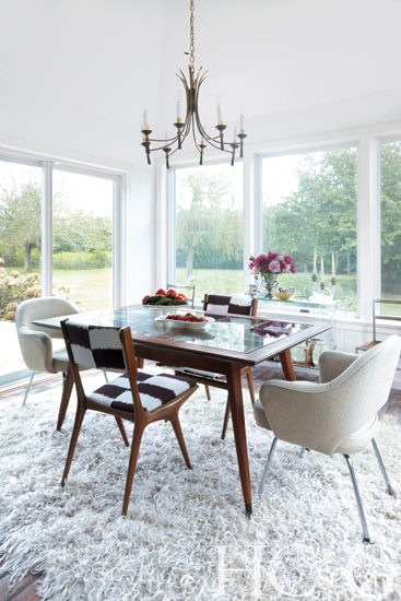Upholstered chairs by Gio Ponti and Eero Saarinen surround a glass-top table in the airy dining room.