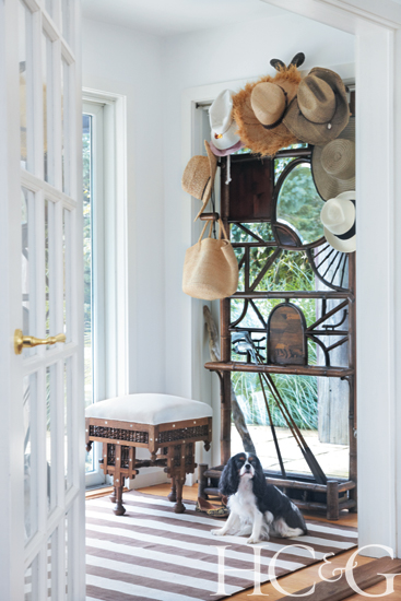 A mirrored French Art Deco hat stand from JED adds panache to the entry; the wood inlaid-bone Indian bench dates from the 19th century.