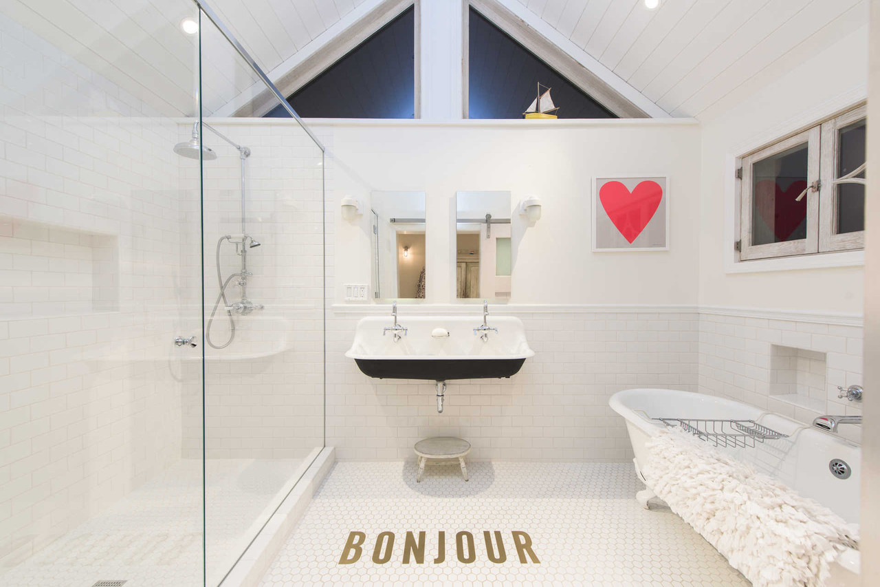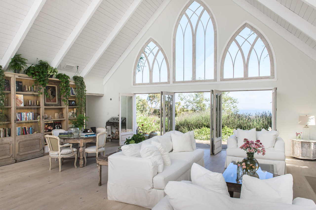European flea market finds now fill the 5,400-square foot space, which is defined by cathedral-style ceilings and sweeping ocean views. The main living area welcomes guests with an open floor plan. The bright white kitchen includes a sprawling center island that signals the couple’s love of both family and entertaining. “It’s all about connection,” Mrs. Izambard told the Journal. “I wanted it to be about family and community spaces.”
