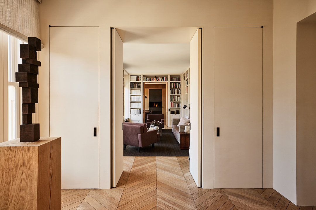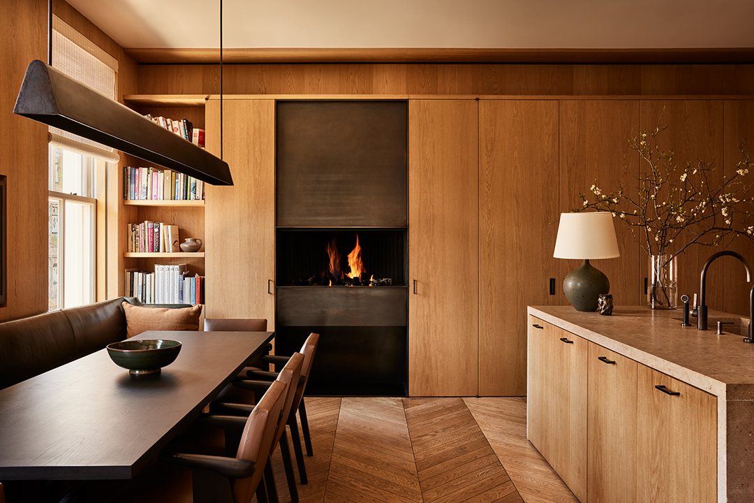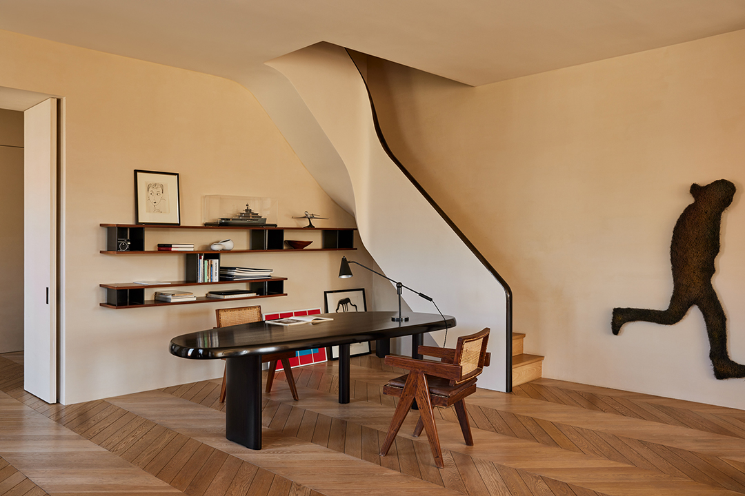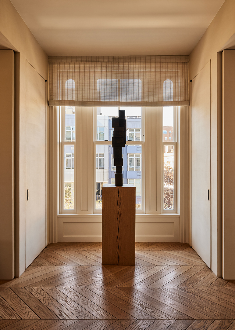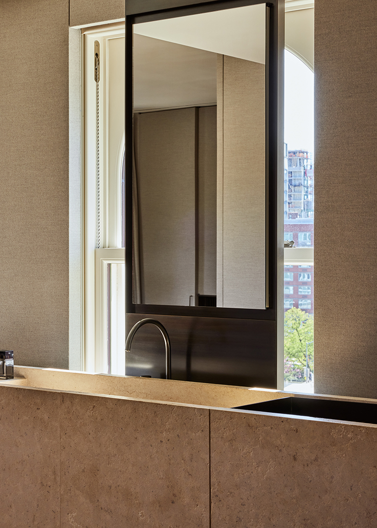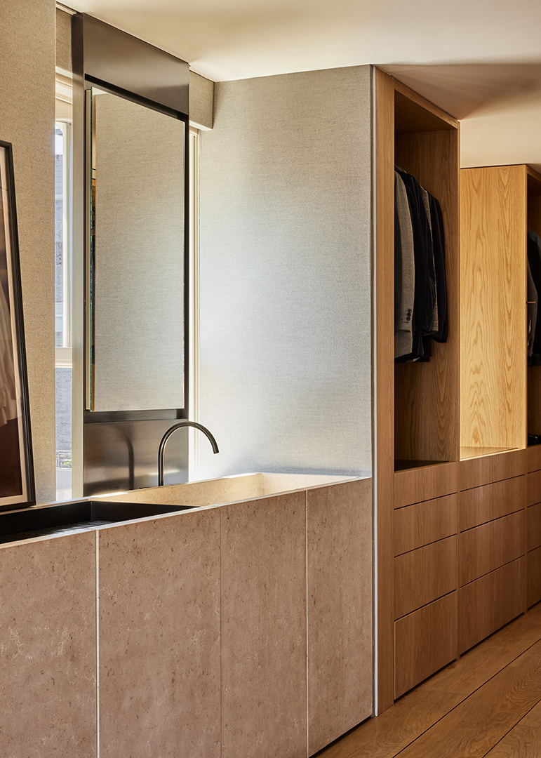 Van Duysen, whose firm is based in Belgium, renovated and curated the five-bedroom unit impeccably. Materials such as French oak, sandblasted limestone, and honed Carrara marble can be found throughout, balancing dark bronze metal elements to achieve a warm, inviting contrast. The kitchen is a piece of art in itself, reeling you in with its smooth textures and earth tones.