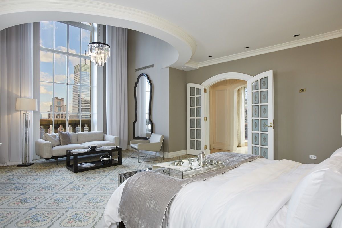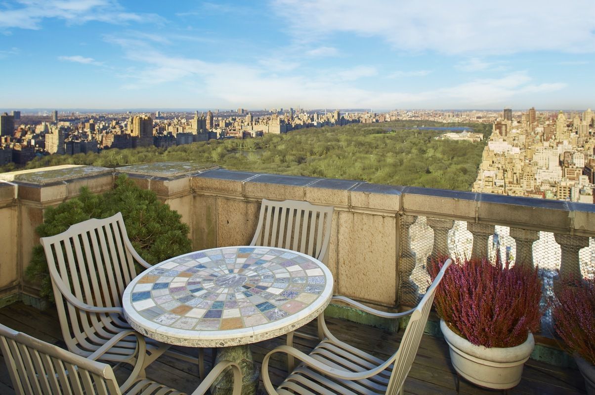 Spanning the top 3 floors of the Pierre Hotel, the penthouse boasts 5 bedrooms, 7 bathrooms and 4 terraces. A private interior elevator accesses all levels. The new owner will enjoy all of the amenities of the Pierre Hotel including daily maid service, 24-hour room and concierge service, valet parking and the fitness center.