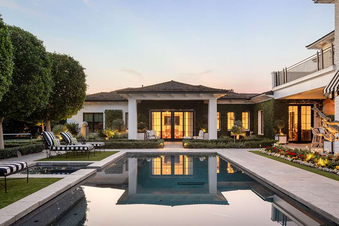 There are a total of five bedrooms and seven bathrooms, but the upstairs primary suite is truly like no other. Essentially occupying the whole of the home’s upper level, the primary suite holds its own wet bar, jaw-dropping walk-in closet, and a spa-like bathroom. The outdoor spaces are just as appealing, holding dining and living spaces, as well as a pickleball court, putting green, heated pool, and spa.