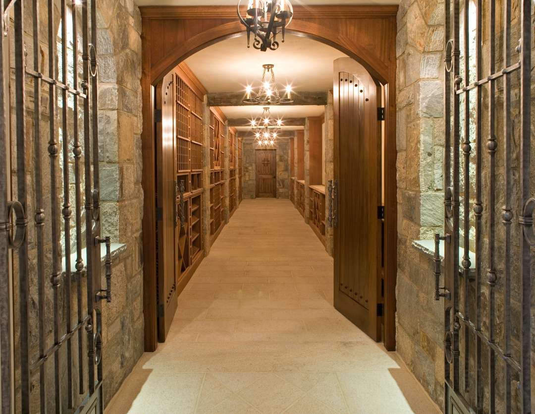 Architectural details throughout are a nod to the nearby Old Oaks Country Club, a grand manor built at the turn of the century. Di Leo incorporated Old World finishes, such as stone, slate, copper, and outdoor verandas. Blacksmith Vaclav Barina of Vaclav Metalcraft worked on railings throughout, as well as iron features in the 5,000-bottle wine cellar.