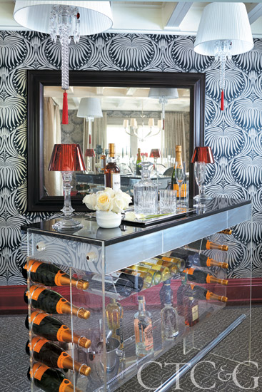 “Our favorite piece is the bar. We wanted a Lucite bar and combed the Stamford antiques shops. Finally, we found one at tiny John Street Antiques.” The duo transformed the vintage piece by topping it with polished black absolute granite from Gault Stone, creating a bar suited for plenty of entertaining.