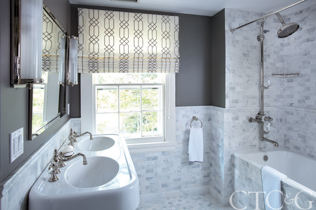In the guest bathroom, Cheviot tub, Sigma fittings, Devon & Devon sink, and Hudson Valley Lighting are all through Klaff’s. Window treatment is through A&M Drapery.