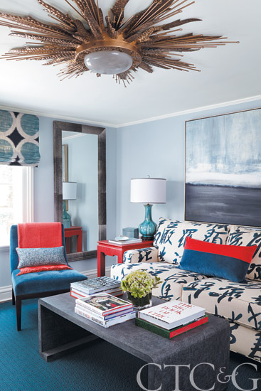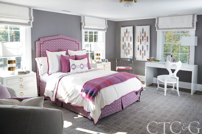 “Having started my career in the fashion industry, I always turn to fashion magazines for inspiration,” says Camarda. “A burgundy, suede-fringed boot caught my eye while perusing the pages of Bazaar, and that was my kickoff point for color.” Her favorite element in the room? “Lillian’s Gibson chair—a modern take on a traditional wing chair in Dewitt fabric with black velvet contrasting buttons.”