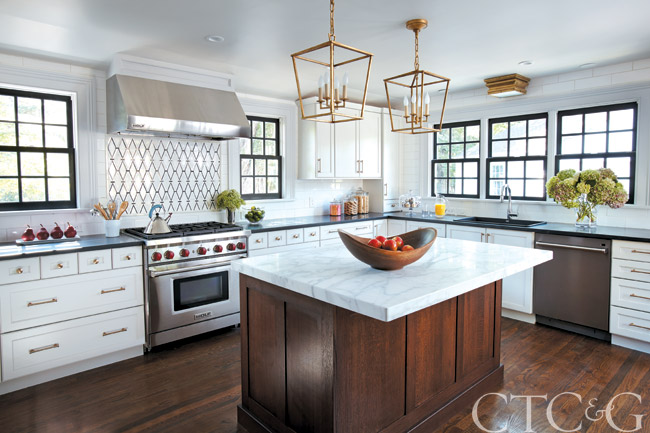 Circa Lighting pendant lights illuminate the kitchen island. Sub-Zero/Wolf appliances are through Aitoro Appliances. Countertops are through Gault Stone.