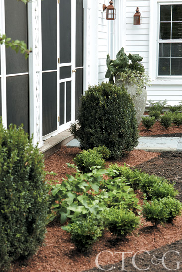 With showhouse time constraints creating extra challenges, Chandler Vinton and the Oliver Design Associates team had to revise the plans moment to moment. “I like the fact that we had to change the plan from a straight hedgerow border,” says Vinton. “We decided to curve the planting bed to pick up the scroll details of the porch.”