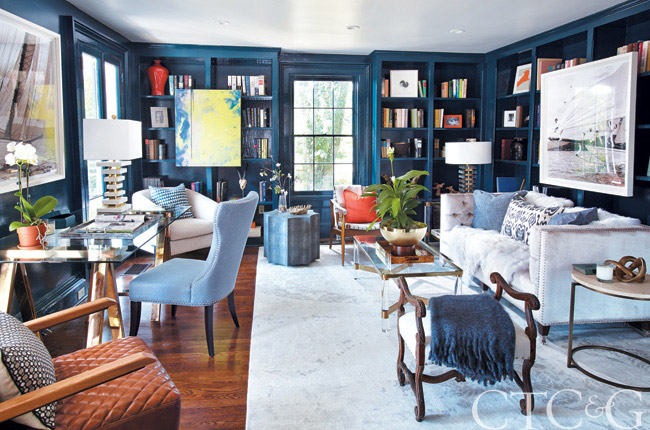 The library was fully outfitted with furnishings and accessories from Safavieh. Lamps are Currey & Co. through Safavieh. Paint is Farrow & Ball’s Hague Blue.