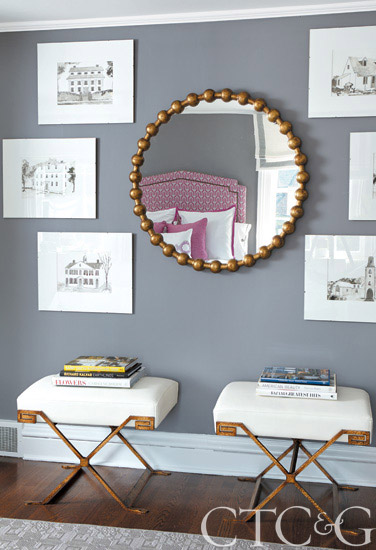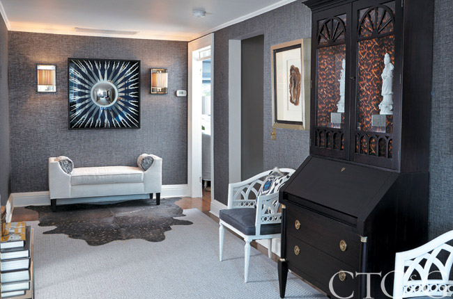 In the upstairs hallway, a custom starburst mirror takes pride of place. Custom bench and pillows are covered in Romo fabrics. Vintage chairs sport a Designer’s Guild fabric. Wall are covered in a shimmery Phillip Jeffries grasscloth.