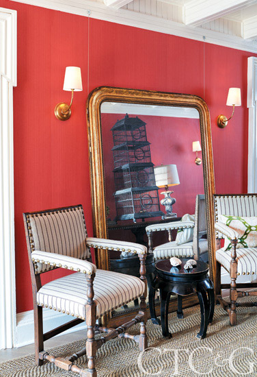 In the foyer, the birdcage is from Hiden Galleries; table is from Harbor View Antiques; table lamps from Circa Antiques. Large mirror is from Le barn Antiques; sisal rug is from Palace Oriental Rugs. Ceiling paint is Farrow & Ball.