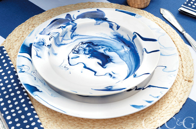 The dining terrace is ready for an alfresco soiree with placemats, napkins and tablecloth from Serena & Lily. Blue marbled plates are Christopher Spitzmiller. Botanica flowers decorate the Lillian August table and Serena & Lily bar cart.This article appears in the September 2015 issue of CTC&G (Connecticut Cottages & Gardens).