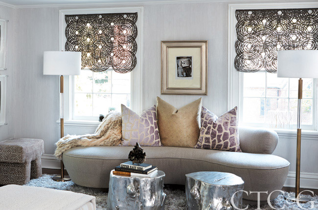 “A master bedroom, to me, should always provide a calm, peaceful ‘adult’ refuge where one can relax and forget the pressures of the workaday world,” says George Snead. “I love the warmth that results from blending warm beige tones into ever popular shades of gray. The same holds true of mixed metals: The shiny chrome of a few years ago yielding to warmer platinum and brushed bronze. Artwork lends a lot of personality to this room.