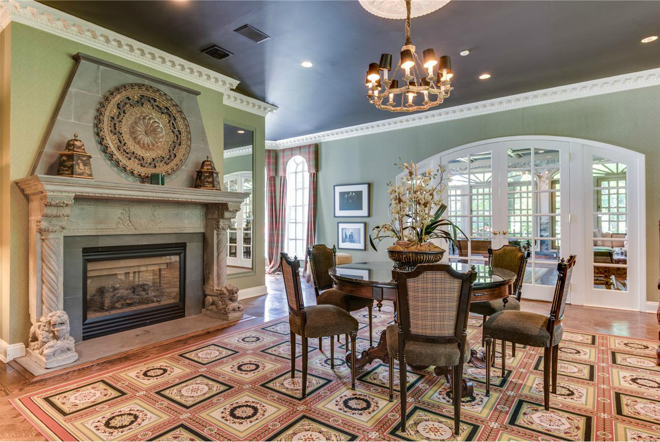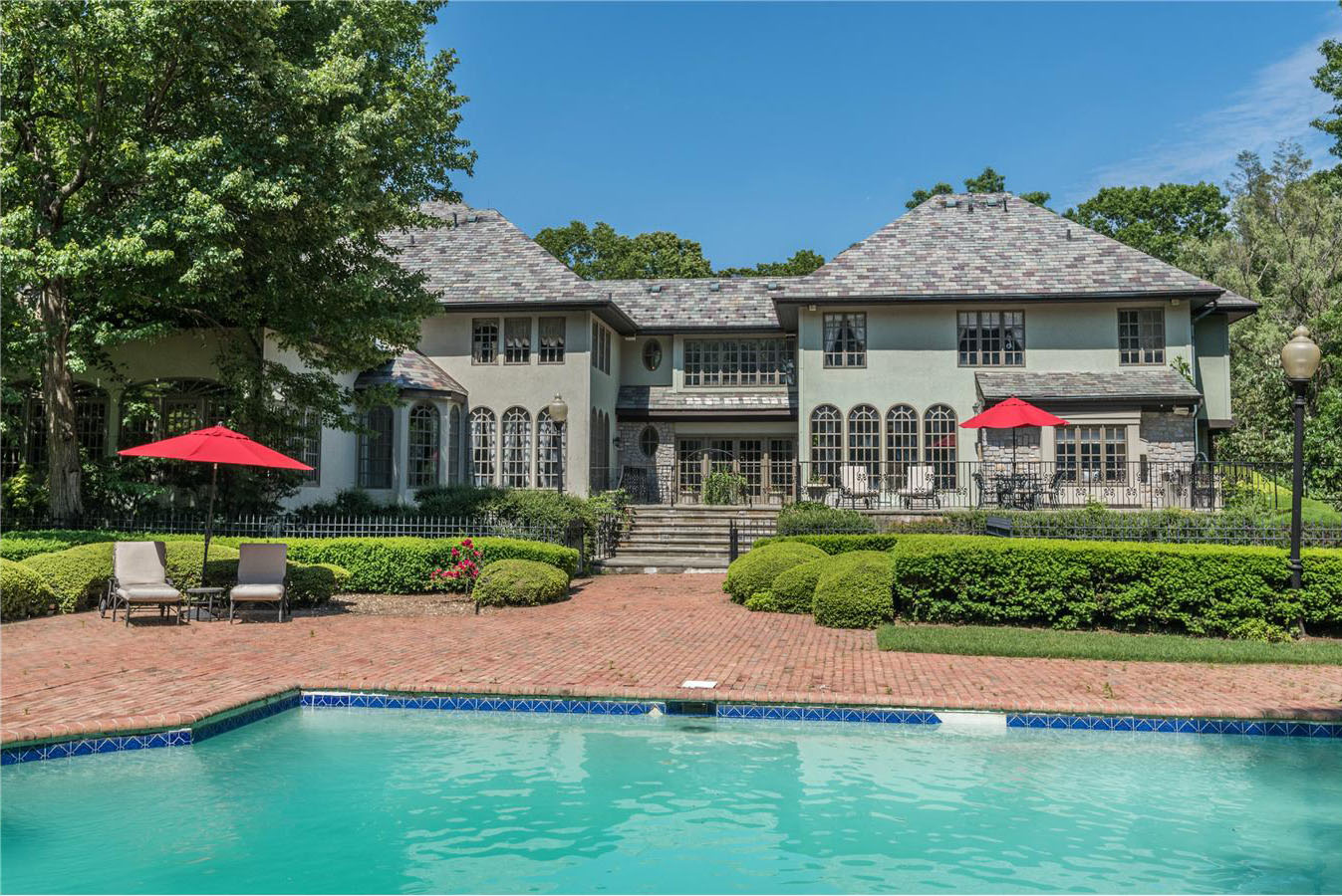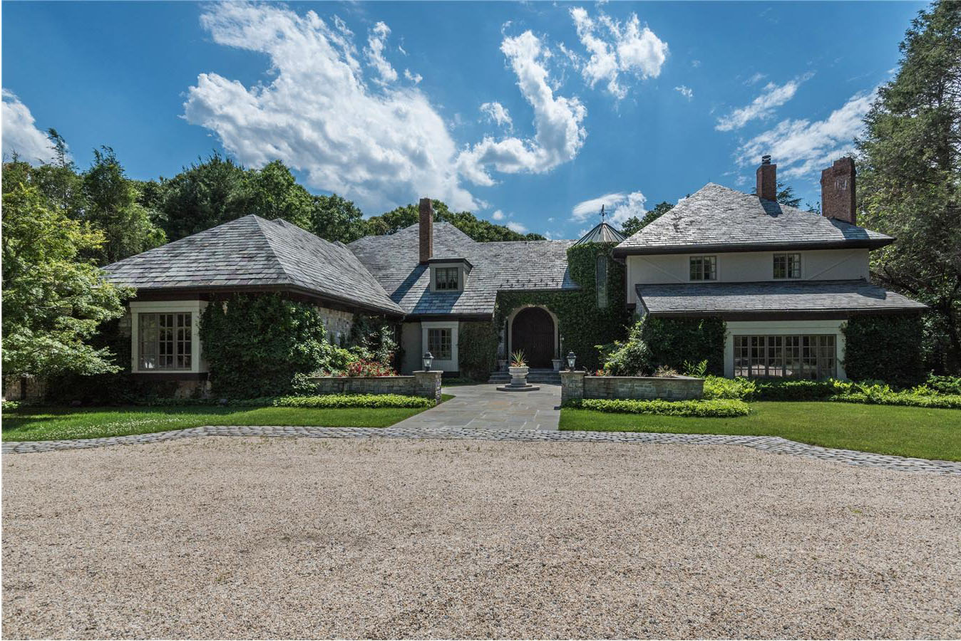 According to the listing, the home has maintained its grand-scale entertaining readiness, but has been transformed by the current owners into a gracious and inviting family home. Inside, a double-height entry foyer features a harlequin designed marble floor and a circular staircase that ascends the turret. A ballroom-sized sunken living room is part of the “entertainment complex,” where there is also a den, lounge and billiards room. Outside, a bluestone terrace spans the rear of the house and overlooks the swimming pool and pool house. Douglas Elliman’s Regina Rogers represents the listing, which was reported by Page Six.