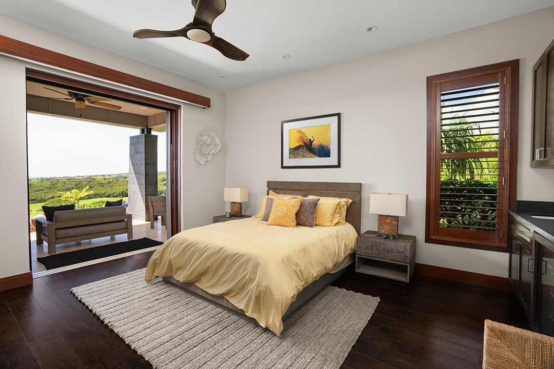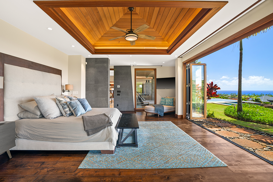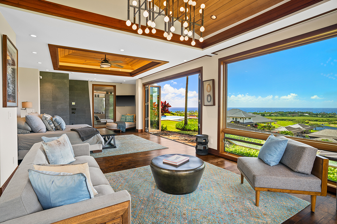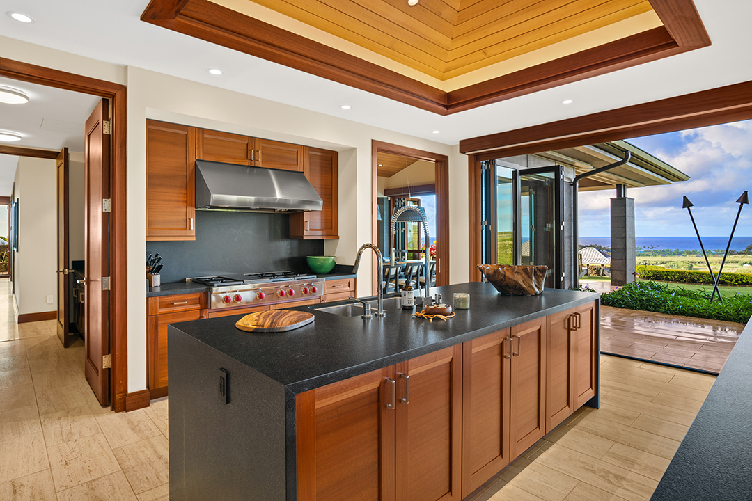 In true Hawaii fashion, the home is like one large covered lanai, holding large doors and windows that usher in warm light and fresh air. A stunning chef’s kitchen, featuring two central islands and top-of-the-line appliances, awaits for an avid cook. Don’t feel too pressured, though, as living within the Kukui’ula community provides access to two restaurants and a clubhouse.
