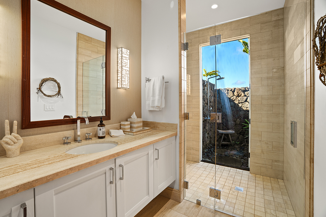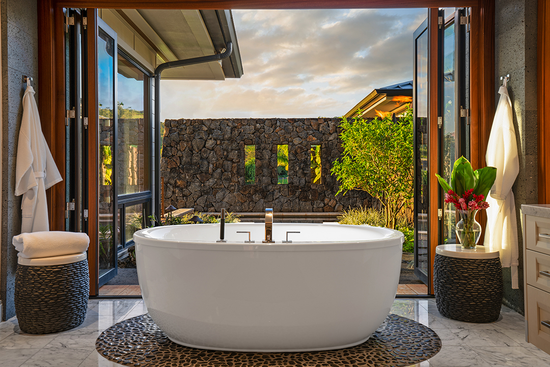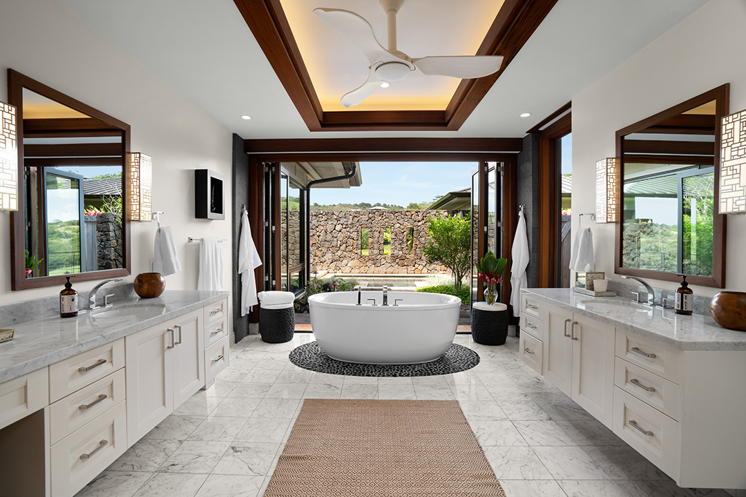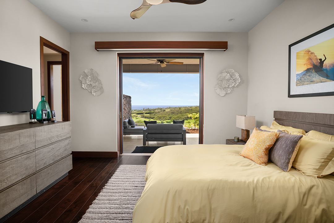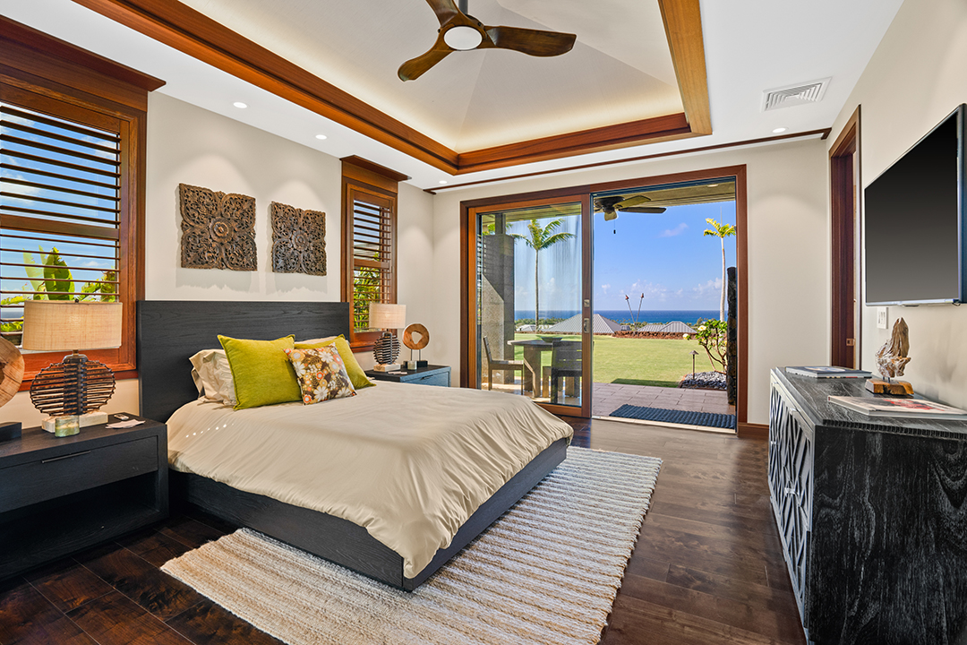 In true Hawaii fashion, the home is like one large covered lanai, holding large doors and windows that usher in warm light and fresh air. A stunning chef’s kitchen, featuring two central islands and top-of-the-line appliances, awaits for an avid cook. Don’t feel too pressured, though, as living within the Kukui’ula community provides access to two restaurants and a clubhouse.