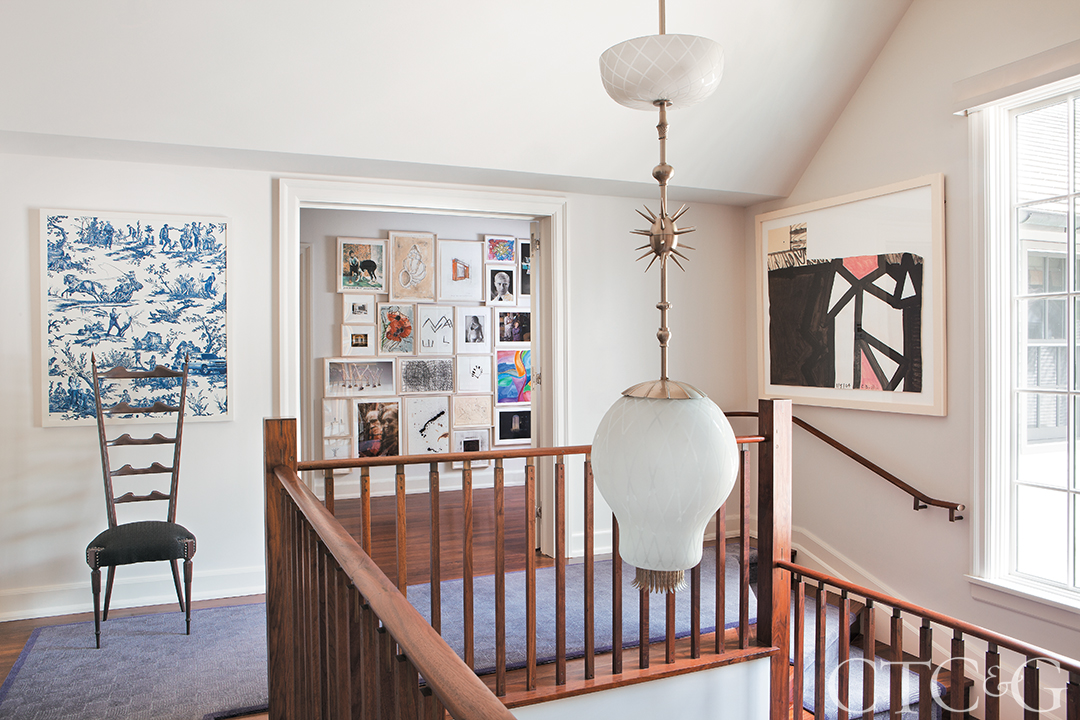 At the top of the main stairway landing in an art-collection couple’s Connecticut home, designer Barbara Hauben Ross created a gallery wall by hanging an assemblage of thank-you cards sent to her clients by notable artists for their work on their behalf.
