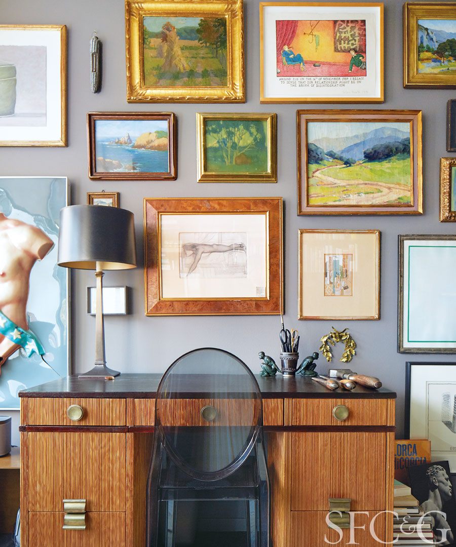 In the study of designer Gary Hutton’s San Francisco home, a salon-style arrangement of Arts & Crafts period landscapes combine with works he inherited or received as gifts on the wall behind his desk.