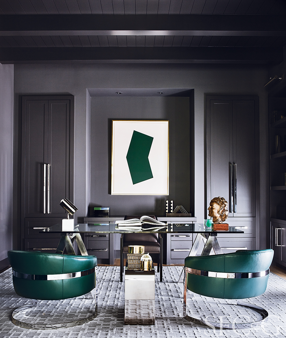 Ellsworth Kelly’s Dark Green Panel is the focal point in the dramatic study of this Atherton home by designer Martha Angus. Its emerald hue is echoed by a pair of barrel-back chairs from the 1960s that cozy up to a glass desktop supported on two sawhorses.