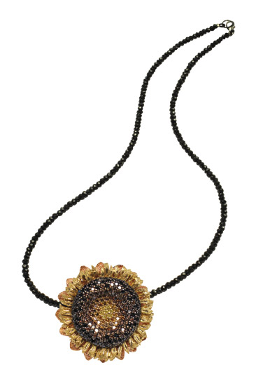 Alex Soldier sunflower pendant/pin in 18k yellow and rose gold with colored diamonds, $12,500 (black diamond strand, $3,500), at Mayfair Rocks, 19 Main St., East Hampton, 631-329-8444, and alexsoldier.com.