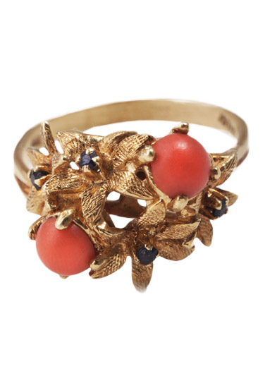 Vintage circa-1950s 18k-yellow-gold floral ring with blood-red coral and blue sapphires, $1,850, at Love Adorned, 156 Main St., Amagansett, 631-267-7720, loveadorned.com.