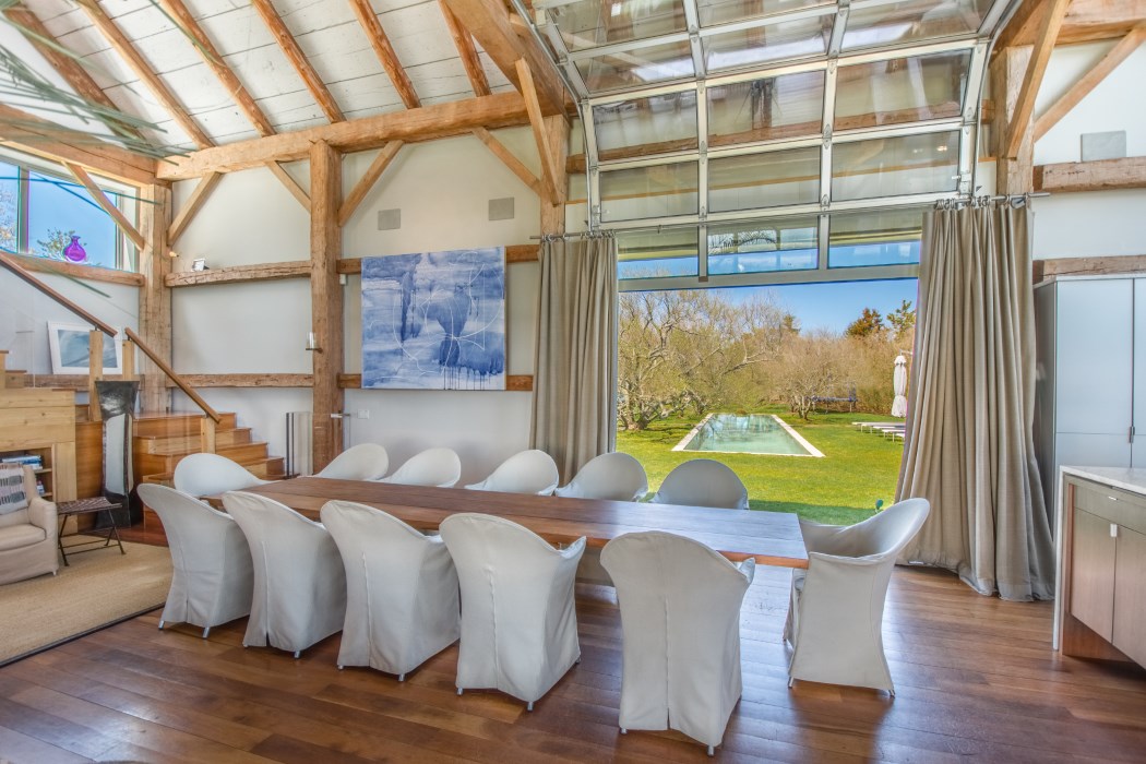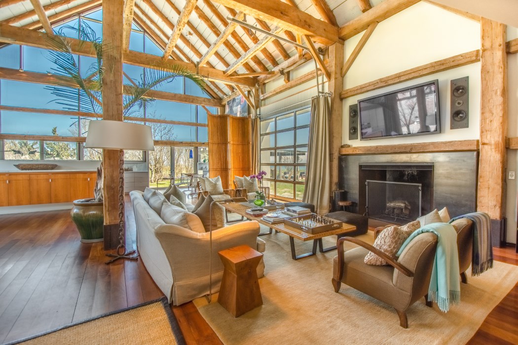 Featuring roll-up glass walls for plenty of sunlight and 250 ft of private shoreline, this home is the quintessential Hamptons getaway. The spacious great room—curated, along with the rest of the home, by designer Tom Flynn—features exposed wood beams and soaring ceilings with plenty of room for entertaining and relaxing. The master suite has a private balcony with a breathtaking view of the ocean and two other en-suite bedrooms, one featuring a four-person steam shower, complete the home.