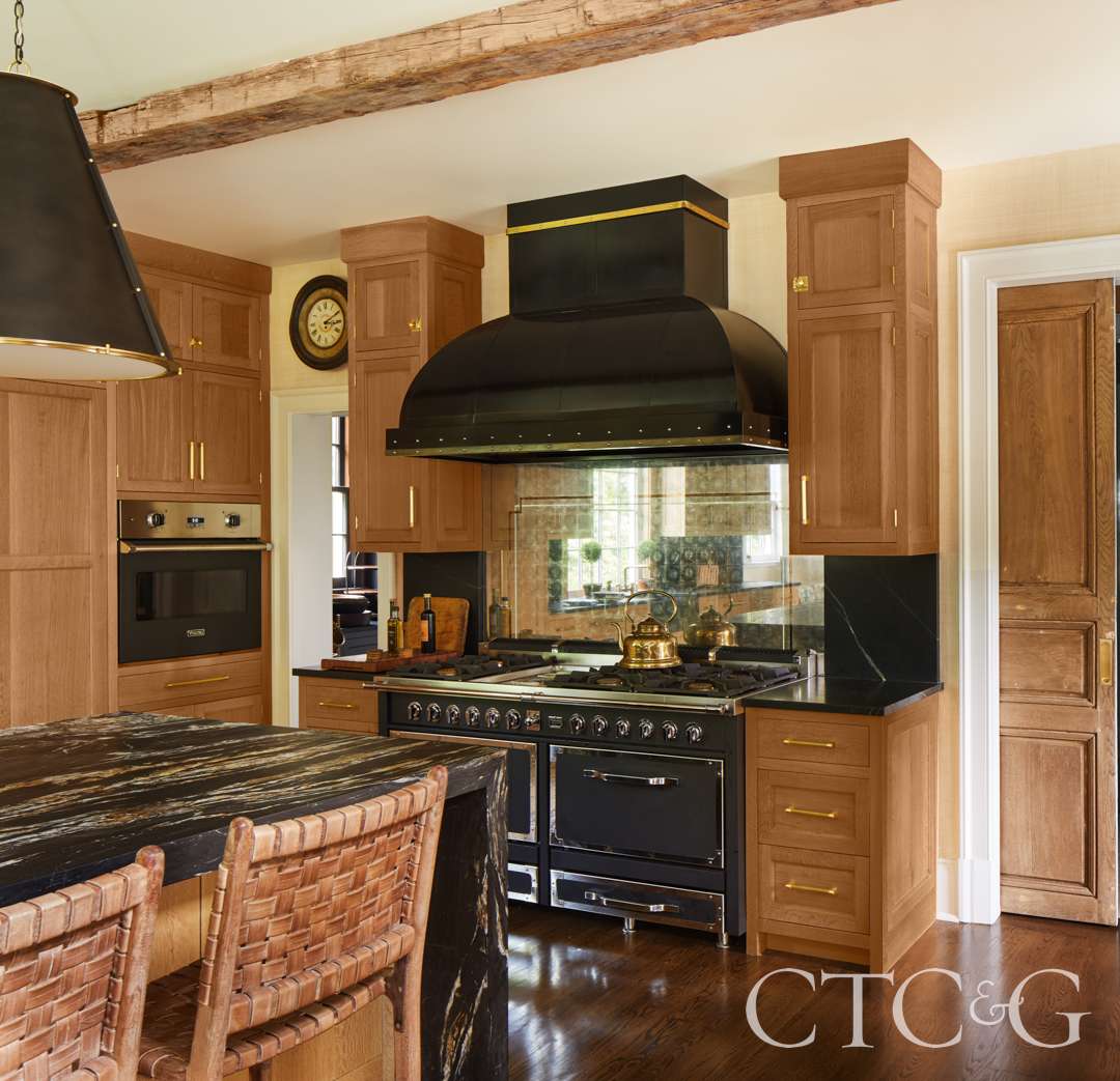 For the decor, Kowles’ process is more intuitive. “I love to buy the antiques first and work around them,” he explains. “I pick what I think might be star pieces, and that’s how I get a direction for each room.” In the kitchen, the antique range hood and breakfast table were the key pieces that set the tone and allowed Kowles to go more modern with the island. The client dreamed of an all-black cooking space, but Kowles felt it would be too stark a contrast to the nearby rooms. So he steered his client to oak cabinetry and black materials with some brightness and luminosity. “The honed black marble countertop has this beautiful veining through it, so it doesn’t feel dark,” he says.