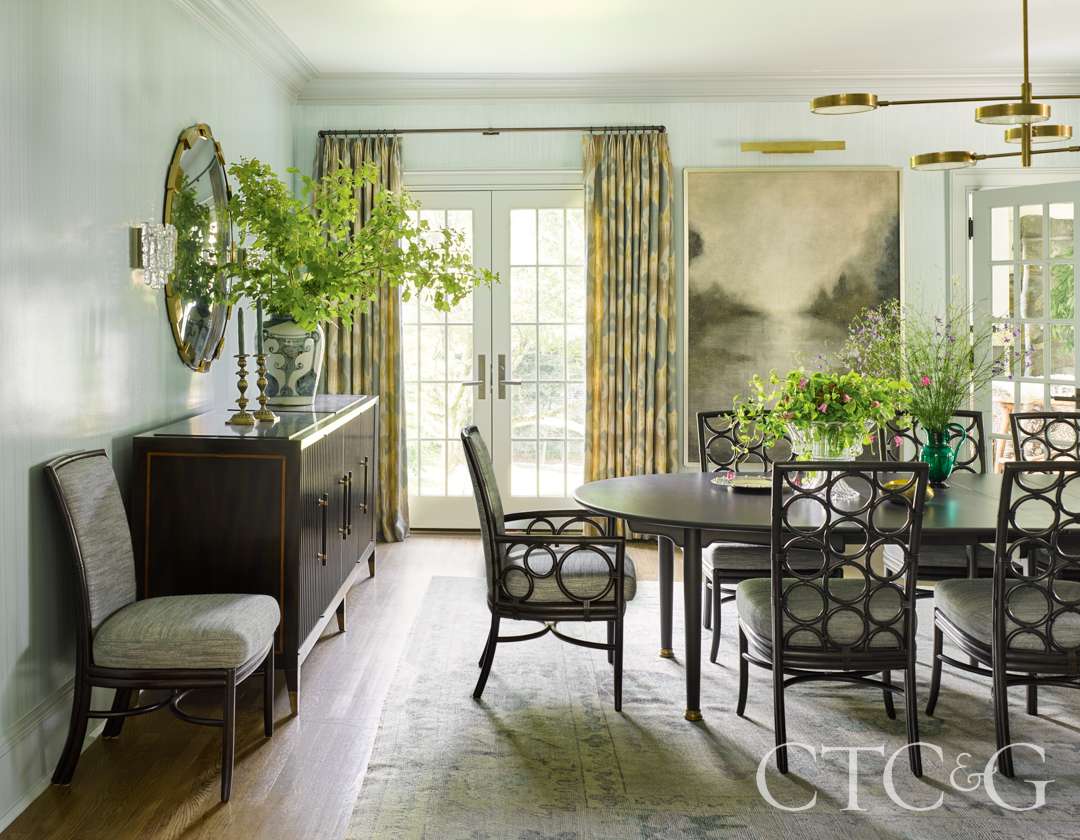 The sideboard by Alfonso Marina set the tone for the dining room. Designer Matthew Kowles stained the client’s existing dining table to match the dining chairs, which are Laura Kirar for McGuire. Decorative artist Shelly Denning painted the walls with a strié finish.