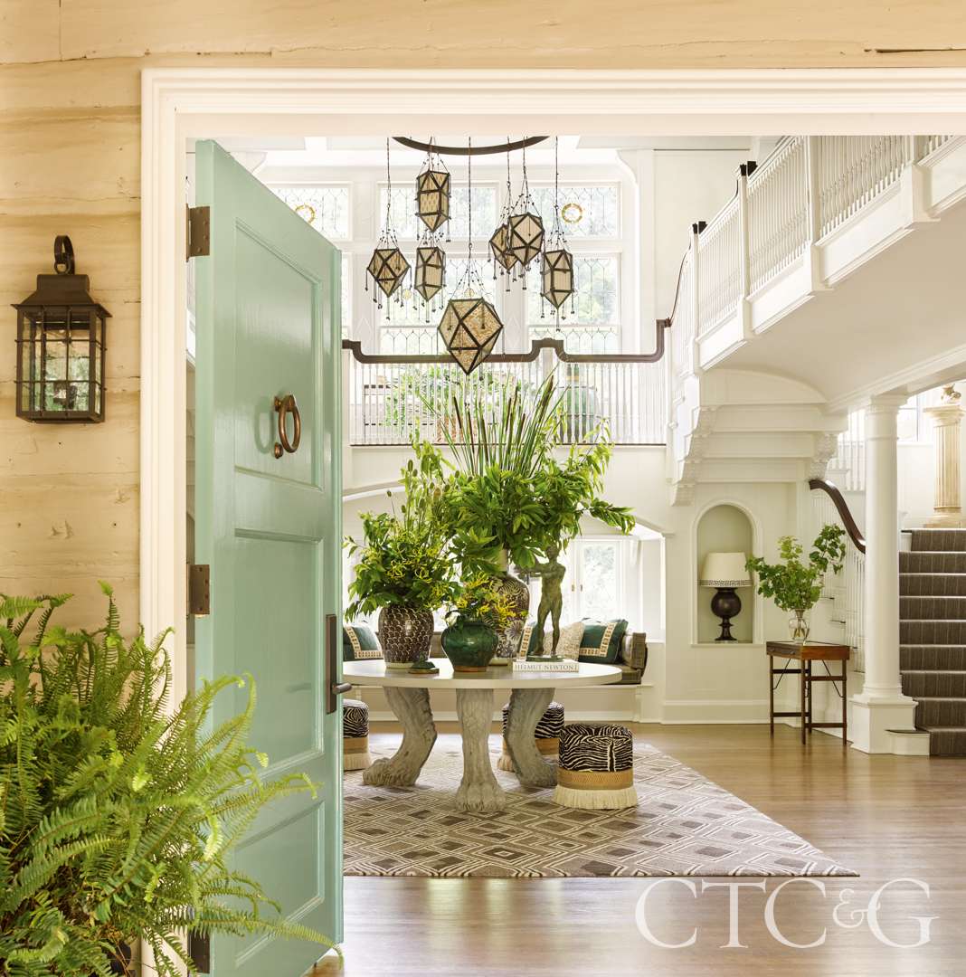 In the main entry hall, Kowles created a custom chandelier using Fortuny’s Venezia lanterns. The lion’s paw table hails from RT Facts.