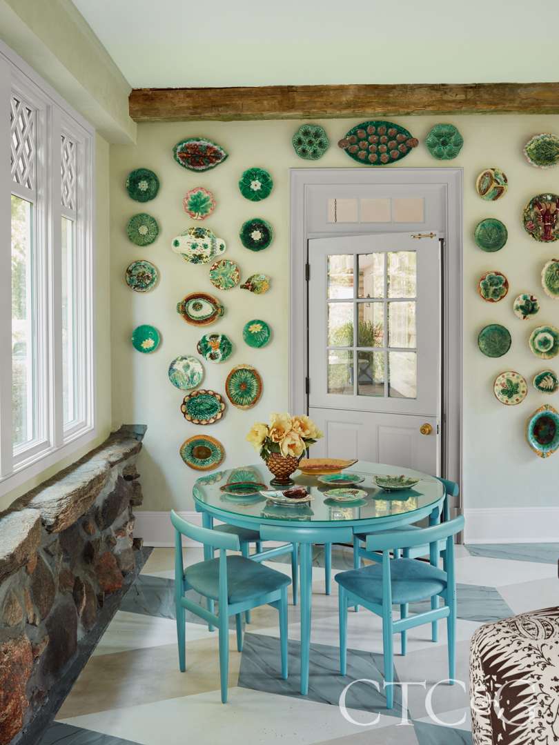 Kowles refreshed the client’s table and chairs with Farrow & Ball’s Stone Blue and mounted her collection of majolica plates as wall art. The floors were painted by Shelly Denning.