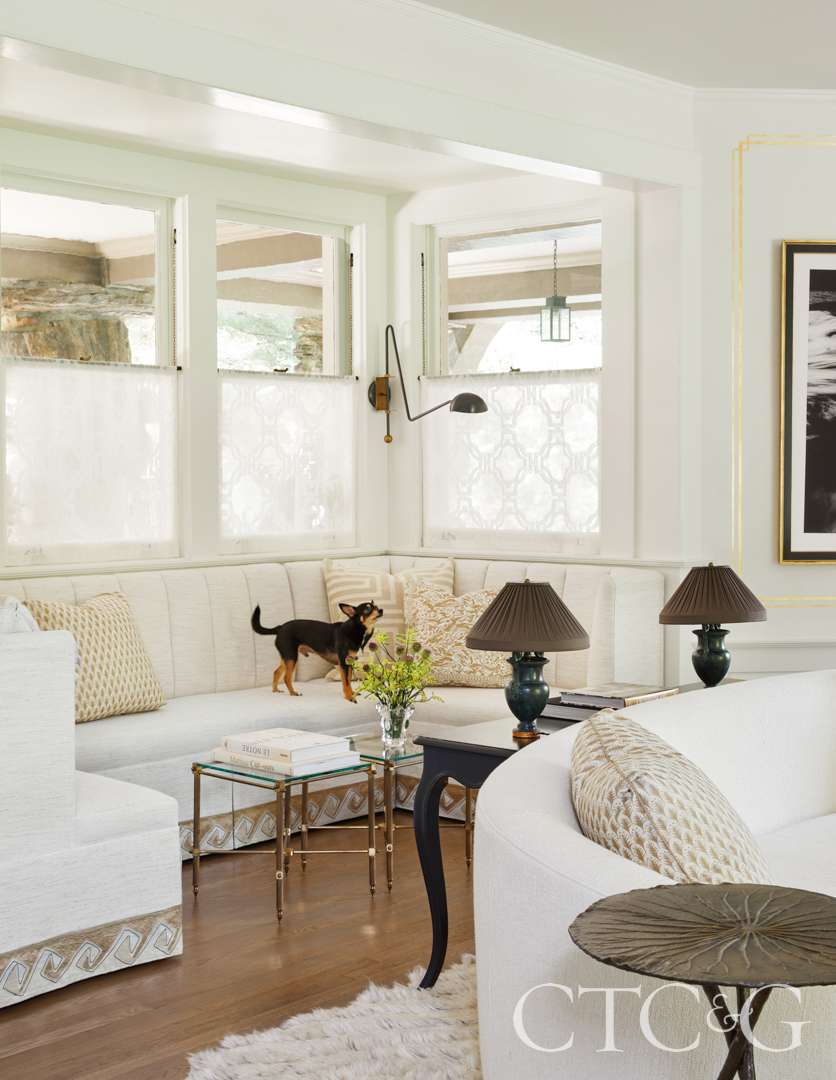 New diamond-separated glass windows from Marvin Ultimate compliment the house’s originals in the media room, where a Lee Industries sofa upholstered in Quadrille Fabrics rests atop a jute rug from Stark Carpet.