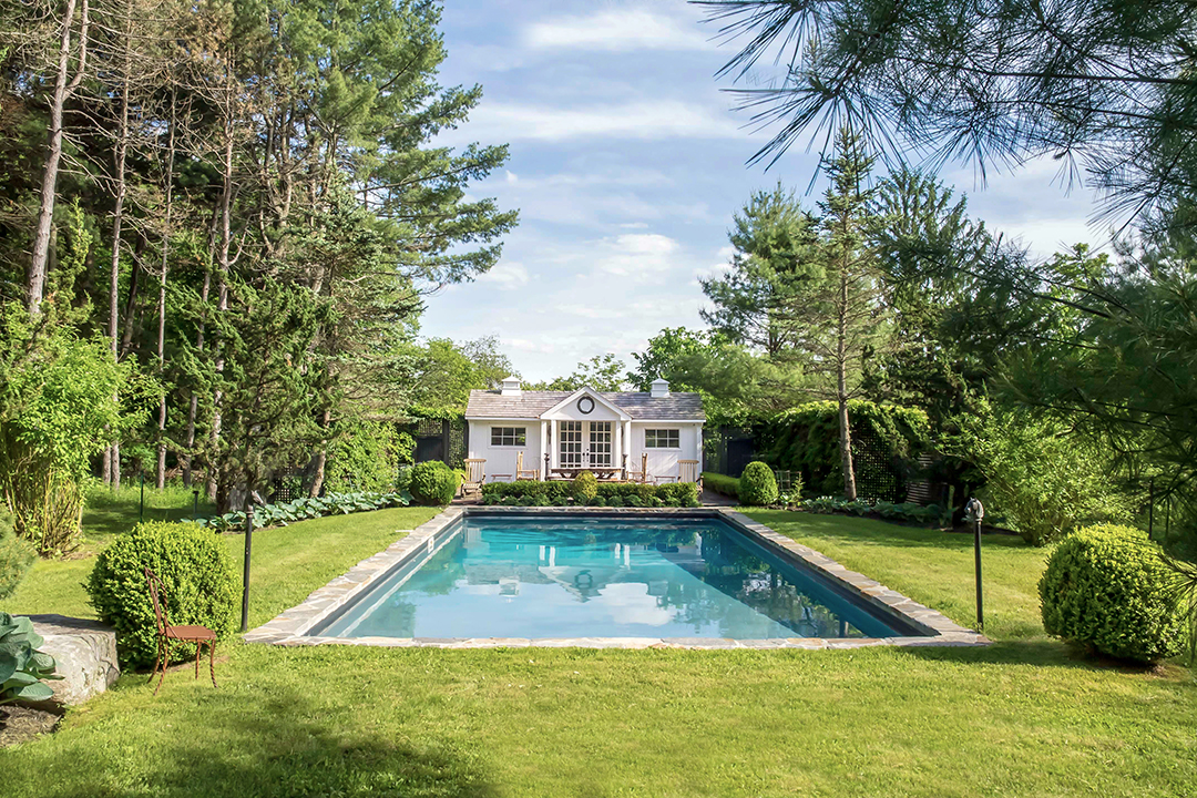 In Warren, a circa-1950 Colonial is noteworthy for the strength of its style. We won’t I.D. the owner, coyly described in the listing as “a Manhattan transplant who might have had an illustrious career in the fashion glossies,” but the home was showcased in a 2011 issue of CTC&G. We love the entrance hall with its gallery of framed artwork lining the stairs and the step-down living room with a fireplace and coffered ceilings. There’s a master suite and guest suite, along with another bedroom and a library. And on the seven private acres: a pool with a chic cabana and a post-and-beam barn. It is listed for $2.495 million with Mark Madonna and Jeffrey Phillips, both of William Pitt Sotheby’s International Realty.