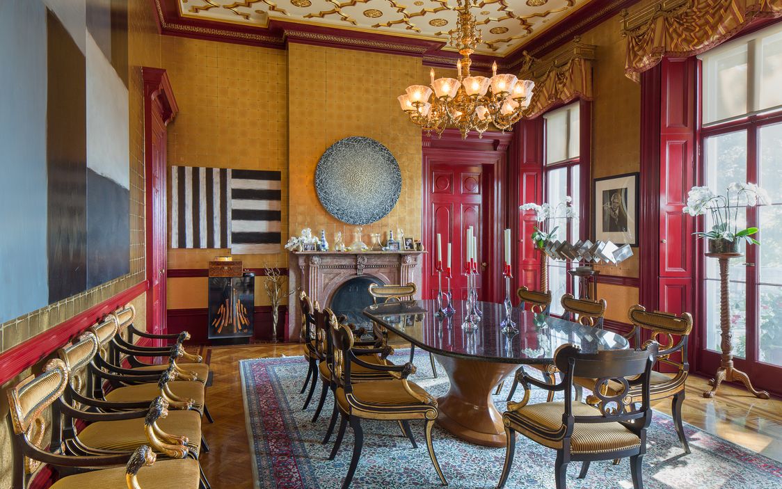 The dining room has a gold-leaf tracery ceiling and gold-leaf walls.