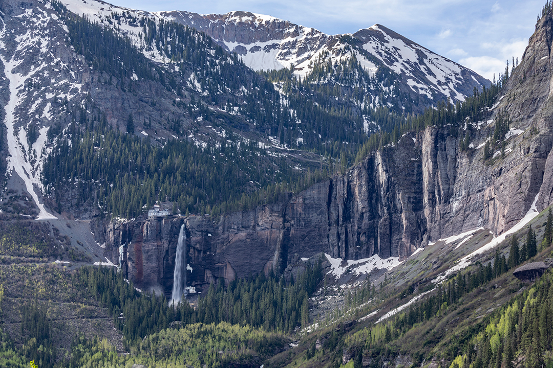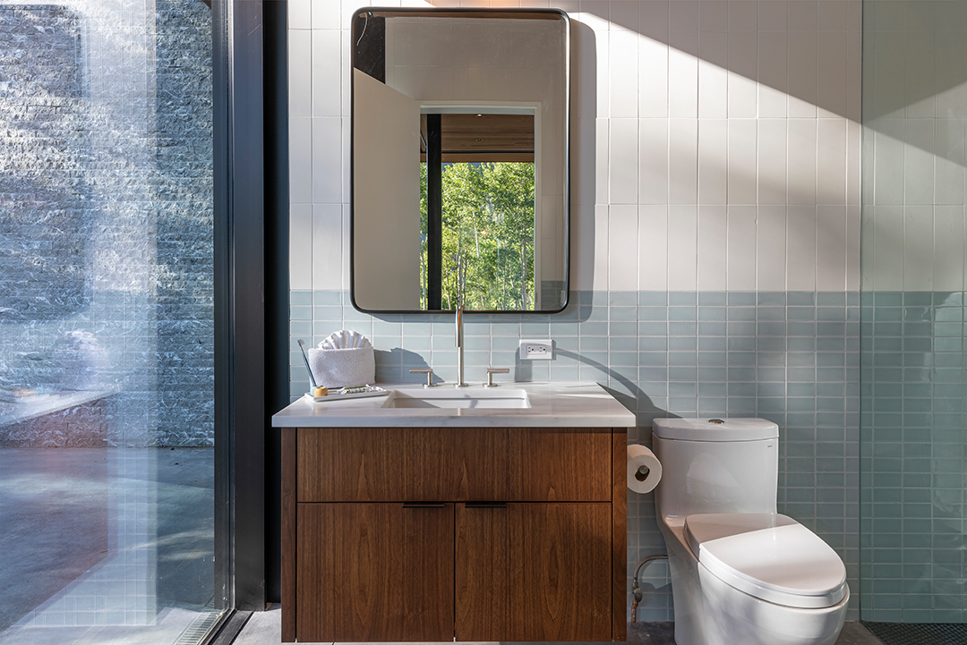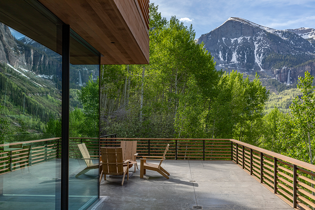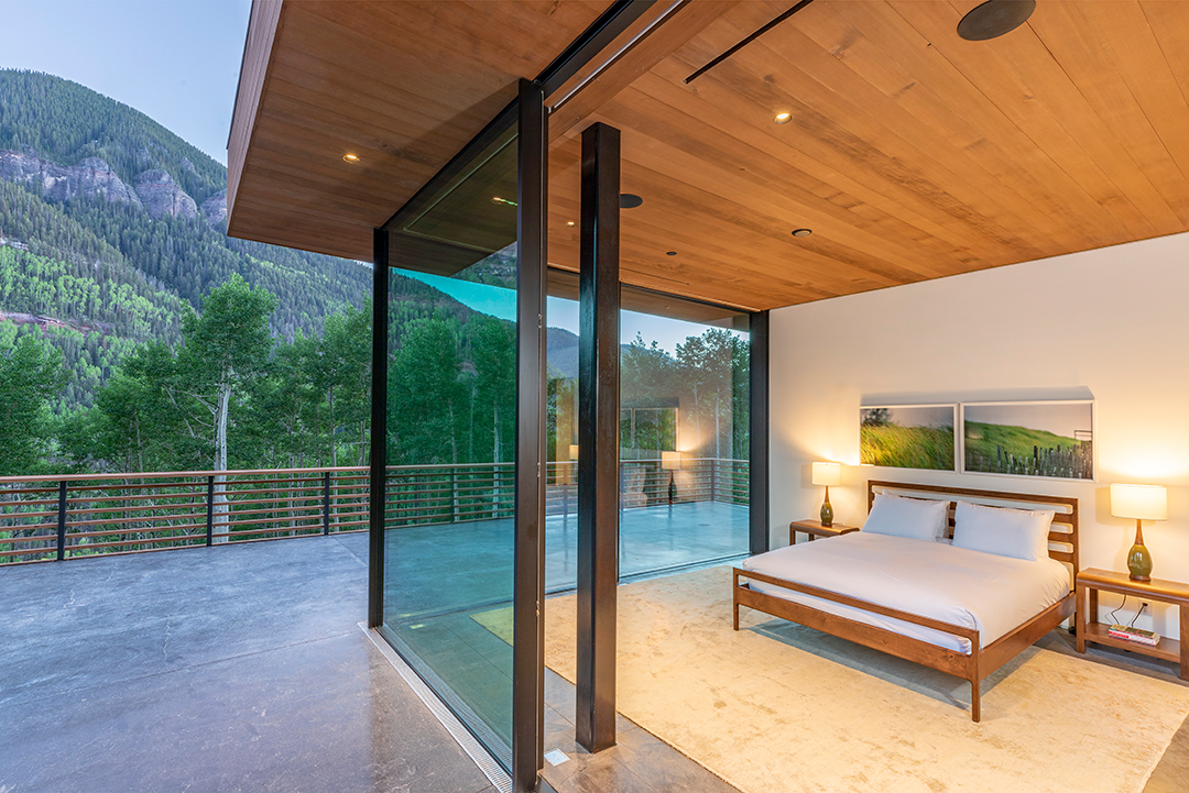 Encompassing a total of six bedrooms and five full bathrooms, the spot couldn’t be more ideal for ski getaways with family or friends. The primary suite sits on the top floor of the home, providing solitude as well as a private terrace. A spa-like bathroom holds a corner tub, capturing stunning views of Bridal Veil Falls.