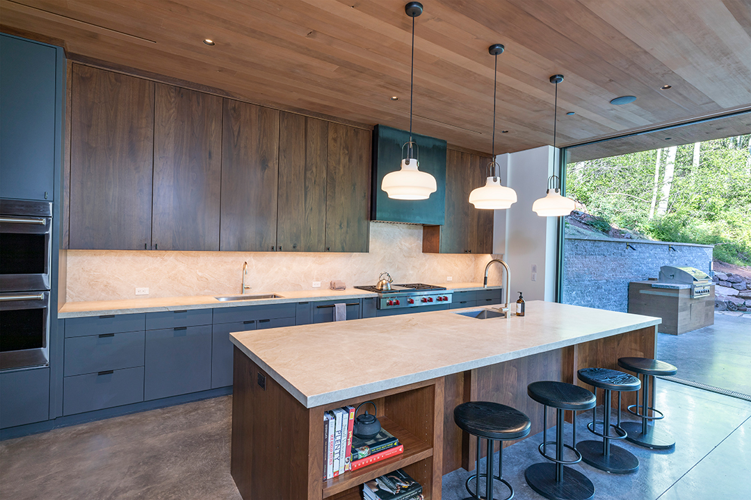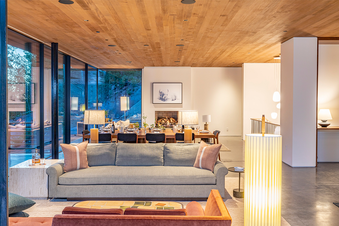 Sited for pristine views and privacy, this newly-built modern on 3.4 acres almost feels like a jagged boulder set on the side of a mountain. Designed by Efficiency Lab for Architecture, the firm’s name says plenty about the minds behind the build. Walls of glass and natural materials like wood and stone wrap the structure, giving a glossy and contemporary twist on the age-old mountain lodge look.