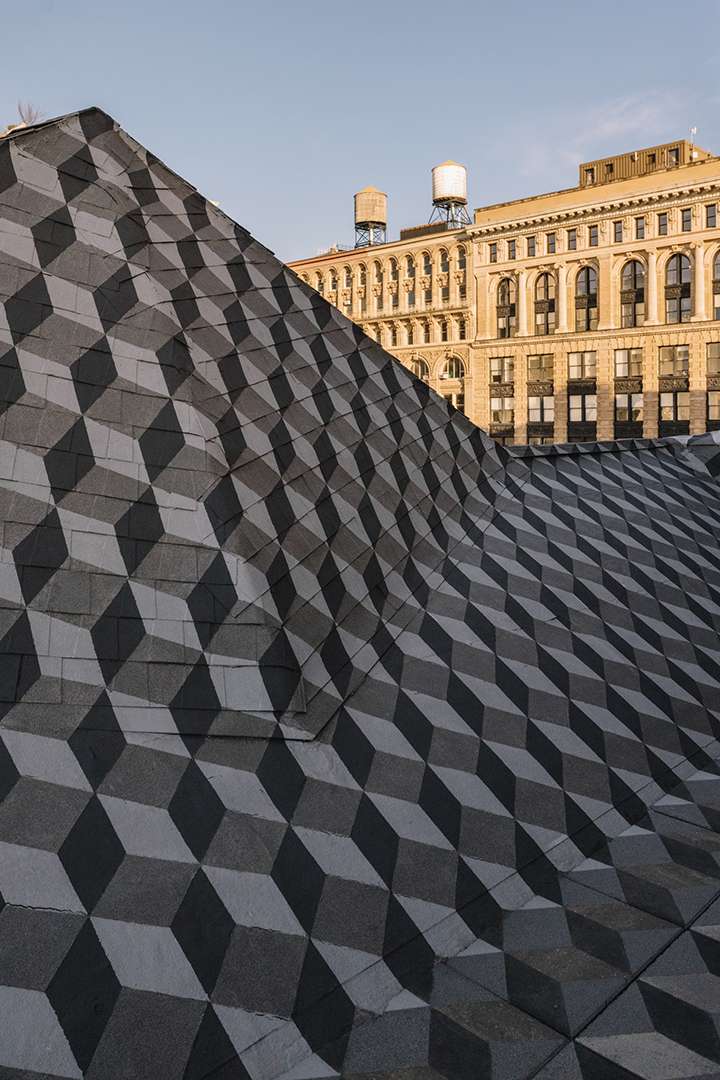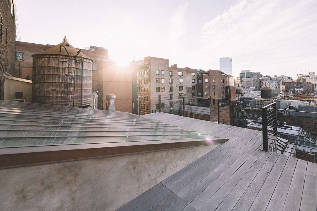 A museum-like staircase is the penthouse’s most striking feature, leading up to the second interior level with just a guest bathroom and cozy nook. Also accessible via this floor is a terrace while the rooftop deck above beckons you to rise higher. It’s a surprising sight to behold with a funky geometric pattern wrapping it entirely and nearly 360-degree views of New York City.