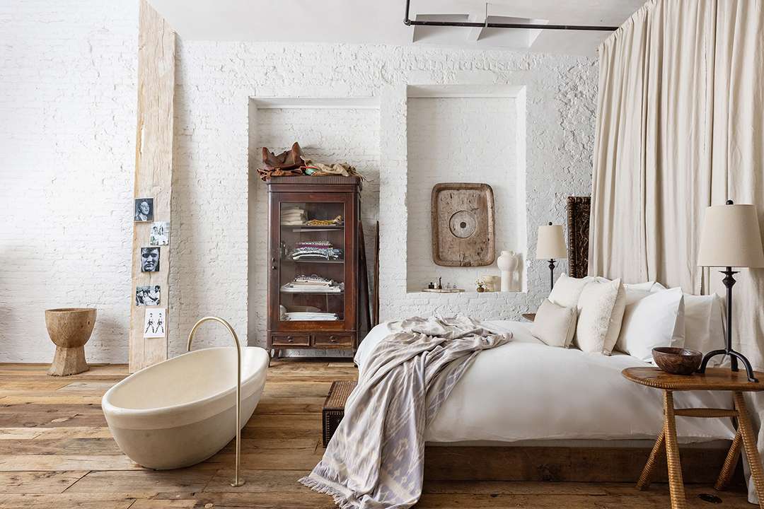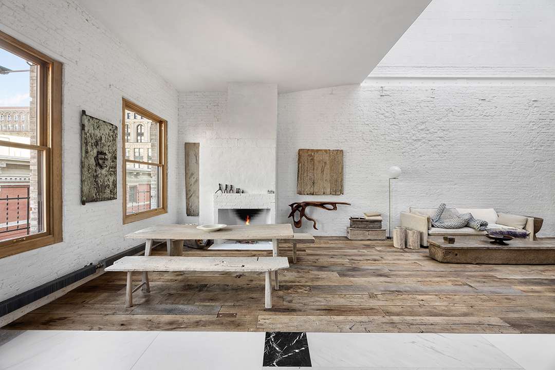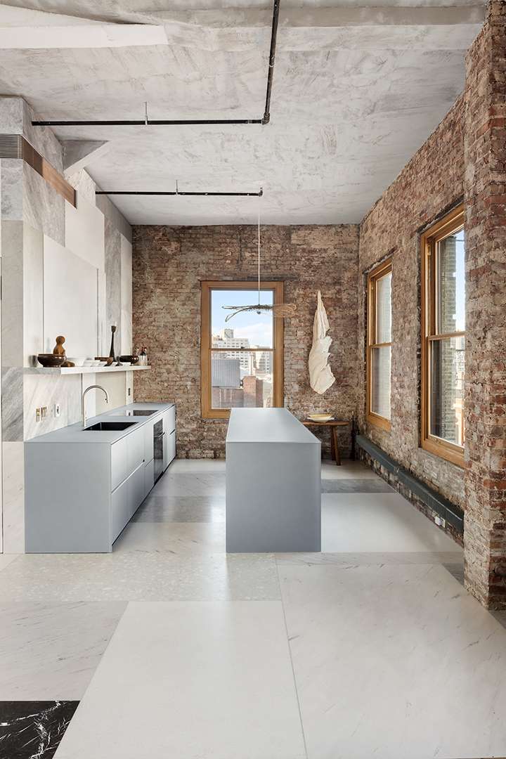 No expense was spared when it came to the fixtures in the home, particularly in the kitchen. Top-of-the-line appliances from Miele, Fisher & Paykel and Sub-Zero sit seamlessly amidst the minimalist space, accented by original brick walls. The primary suite also sits on the main floor, bound by no interior doors or separations. John Pawson fixtures and a Belgian clay soaking tub adorn the ensuite, amplifying tranquility and texture, a theme seen throughout the SoHo pad.