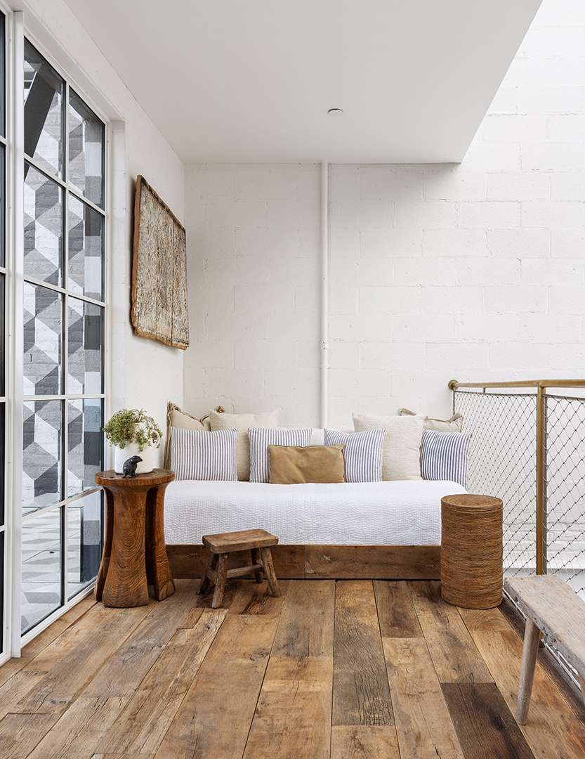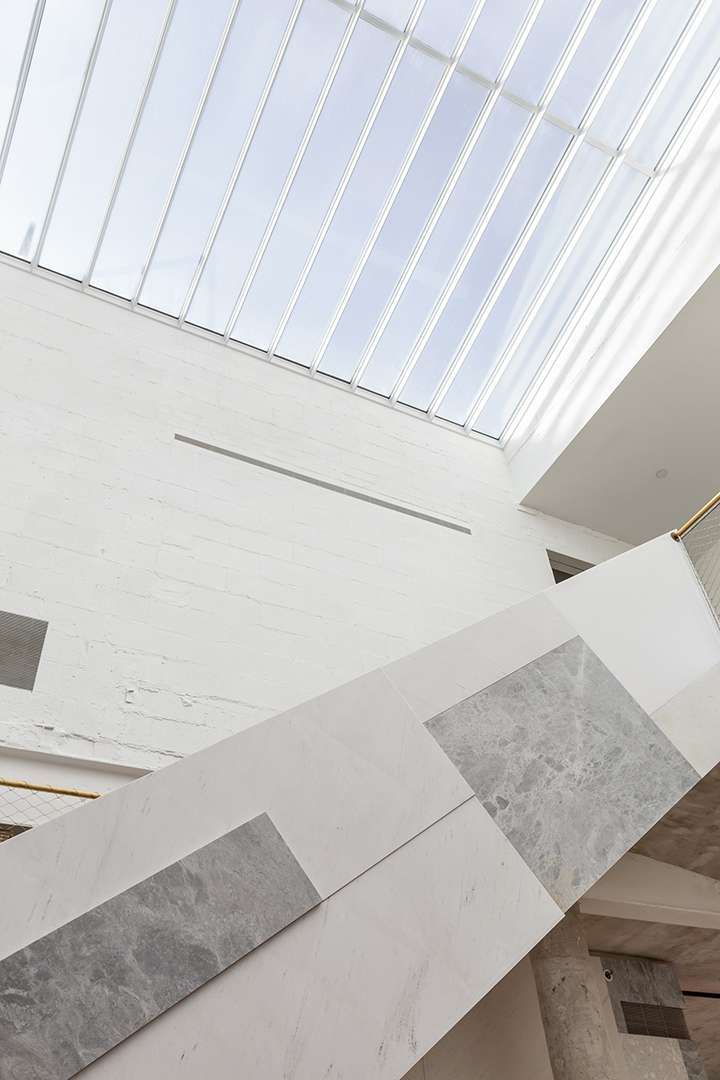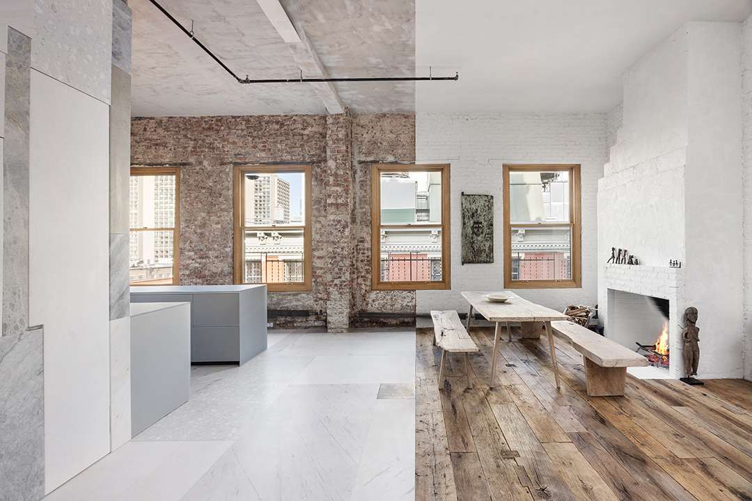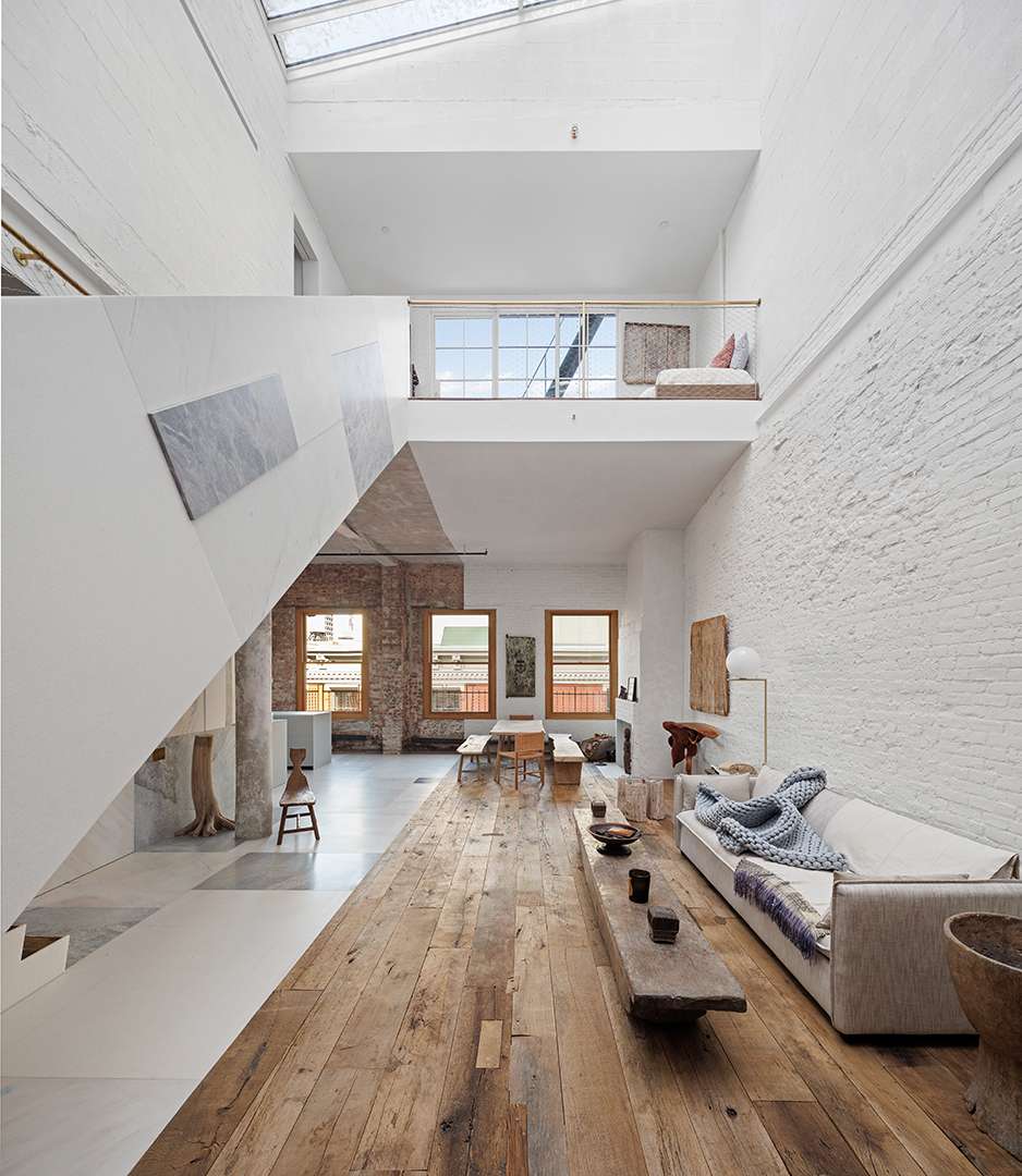 The Prince Street building was originally constructed in 1900, and there is a beautiful mix of the old and the new here. Leeser incorporated 17th-century reclaimed wide wood planks in the floors, and then used unexpectedly placed marble slabs to add dimension. A 30-foot skylight soaks the main floor and loft in light, which makes the open-concept floor plan flow even smoother.