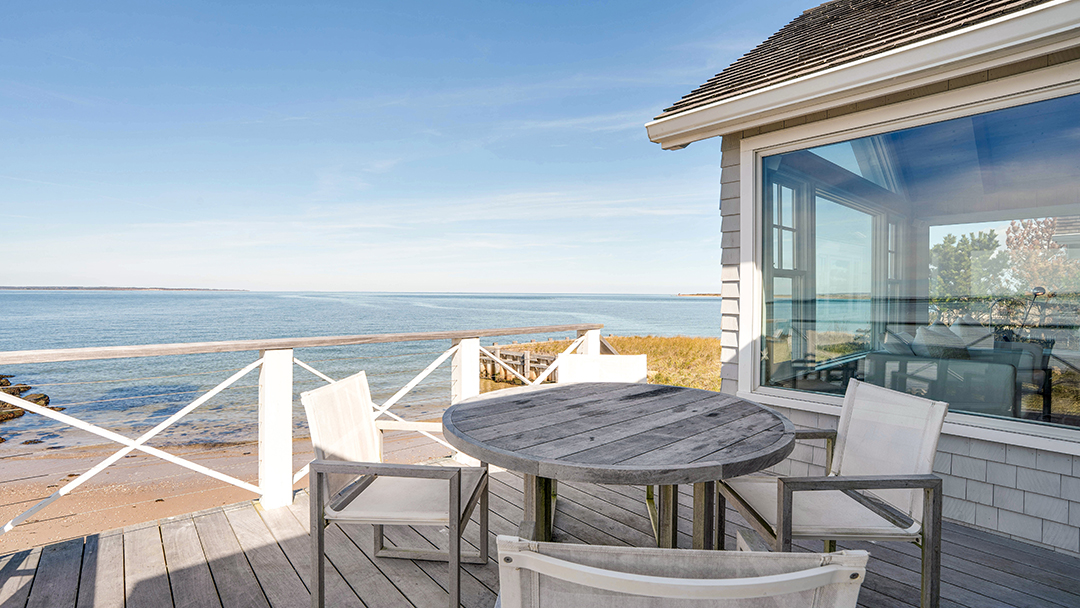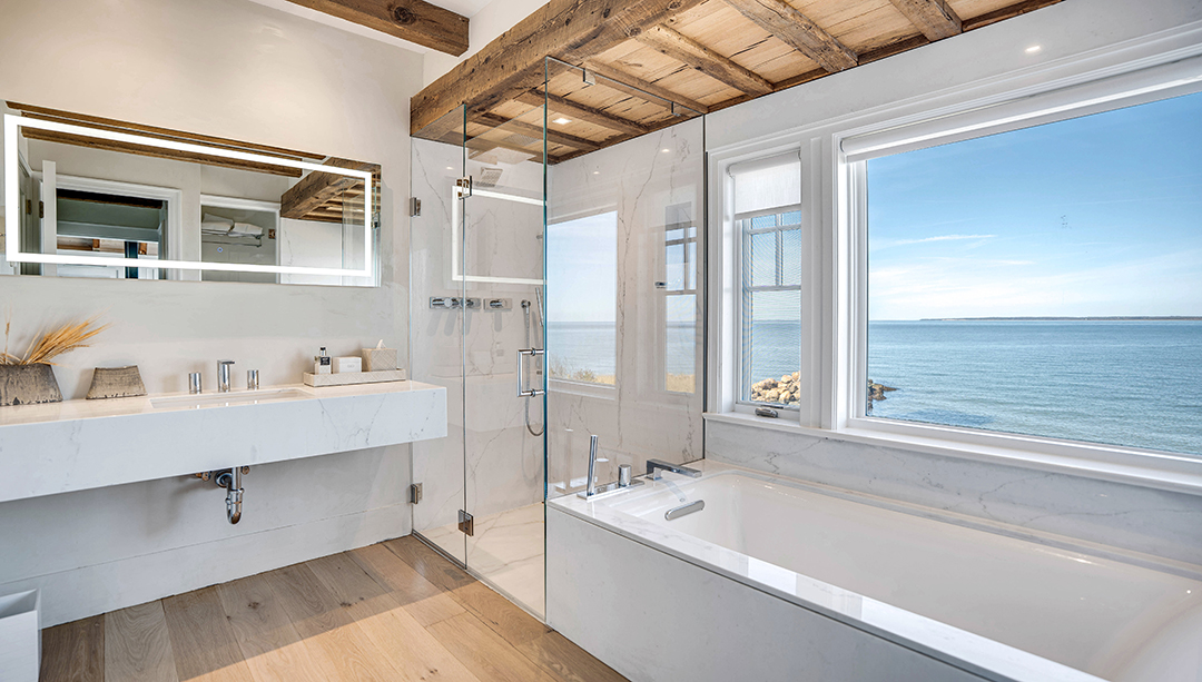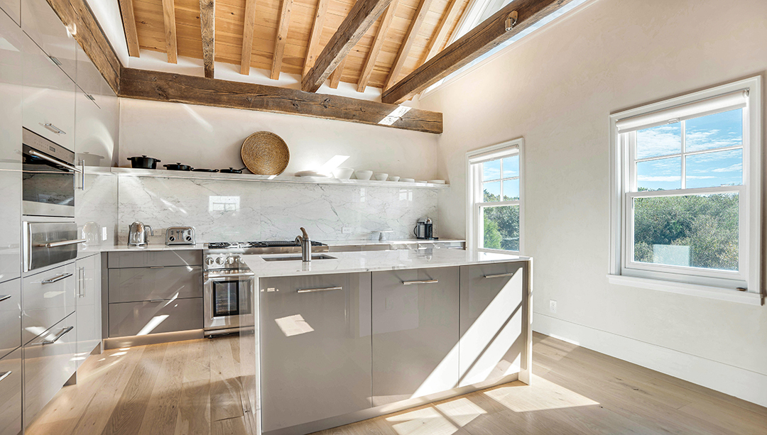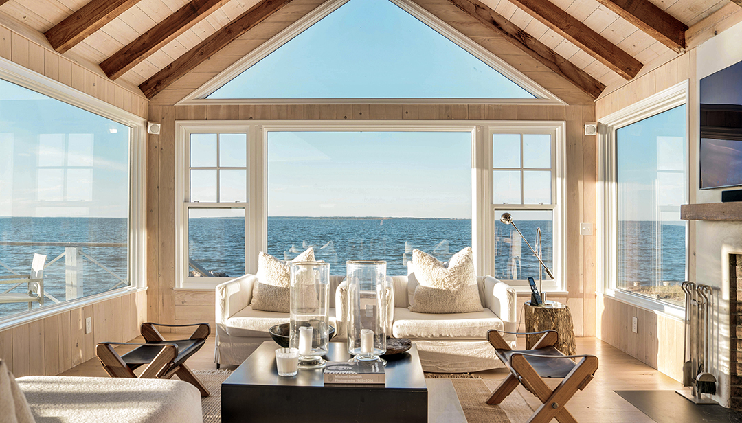 That’s not the only way this property blends influences from the east and west coasts. The interiors have been designed to exude a relaxed and laidback airiness while still displaying tailored elegance that reflects the Hamptons. Neither too traditional or too modern, the chic spaces embrace a fresh, coastal sensibility. Most importantly, the main living areas and primary suite have large windows that frame views of the peaceful bay and let light flood in, while wood-vaulted ceilings add subtle, rustic warmth.
