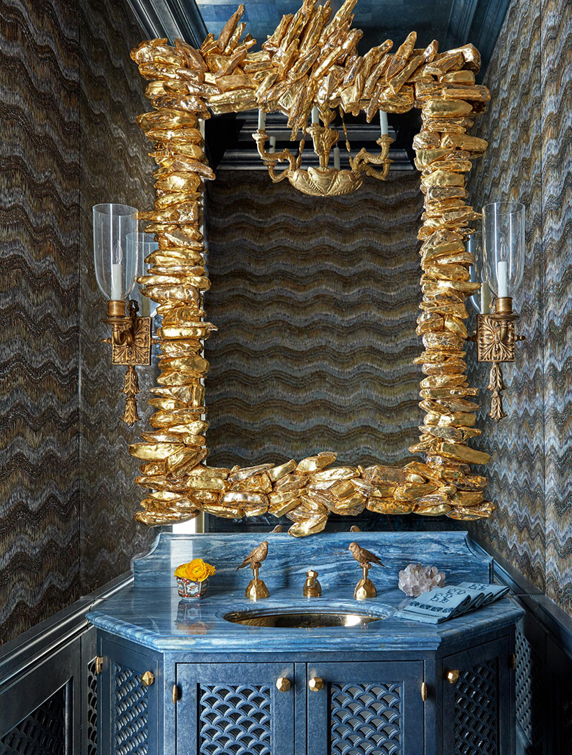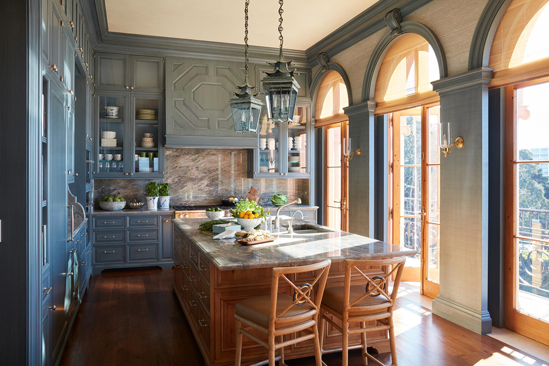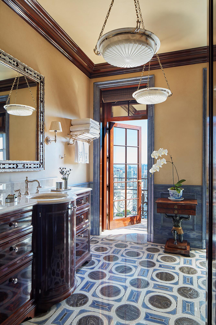Per her website, Tucker shared, “The design concept was to color the elegance of the residence with the welcoming ease of an English country house.” Rich wood finishes and delicate pastel hues contrast each other throughout, working to achieve this timeless aesthetic. The clients’ affinity for blue also guided Tucker when crafting their spaces, and what better way to subtly complement the glistening skyline and Bay views? The chef’s kitchen dressed in a muted blue and the French doors leading to wrap around terraces create a feeling of lightness amidst the clear grandeur. Whether a new owner opts for hosting dazzling dinner parties in the dining room or quiet nights by the fire in the study, luxury living above the clouds is a given.