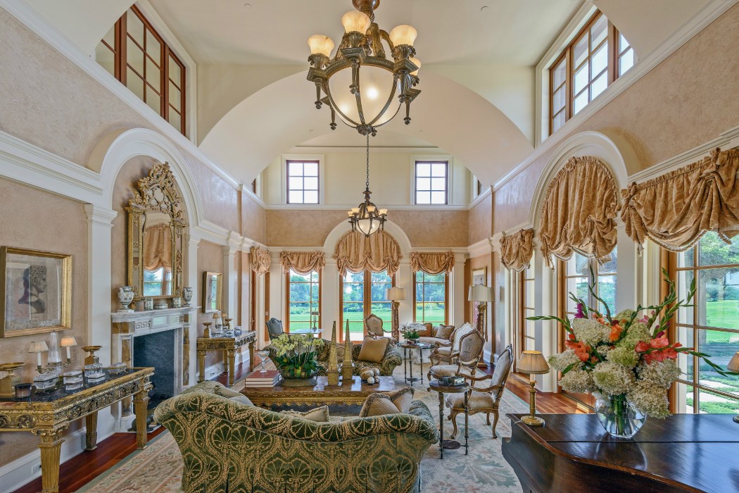 A marble fireplace anchors the grand living room.