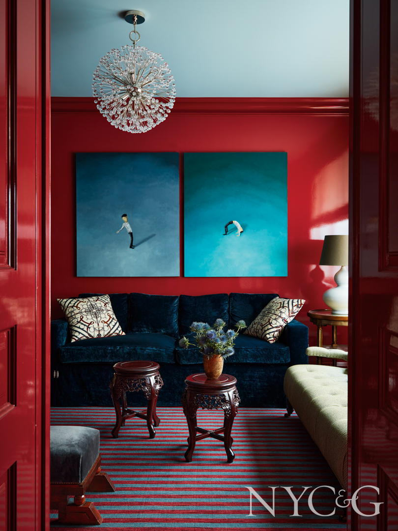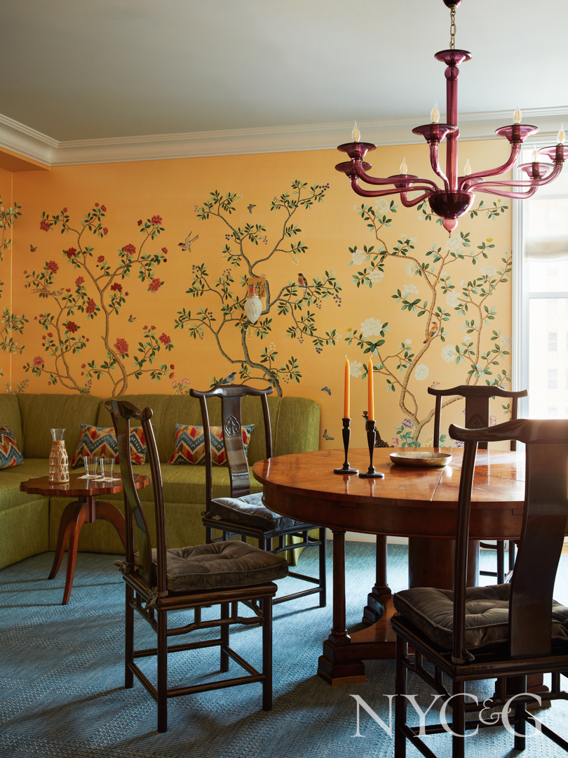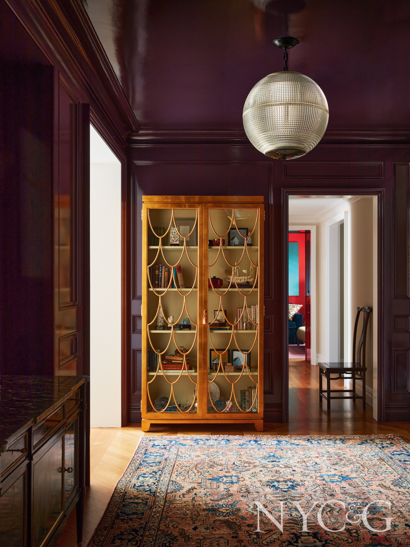 Fearins responded to the color cue by infusing rooms of the now well-ordered apartment with vibrant jewel-like tones. A glossy aubergine was chosen for the foyer that keys visitors to a kaleidoscope of colors elsewhere. A deep red in the family den/ library is as warm as fire, a key feng shui element. A blue kitchen (perhaps the Kitchen God’s favorite hue?) was configured to be as maintenance-free as possible, with a wipeable countertop and backsplash. A corner of the dining room, wrapped with a green sectional, is backdropped by a Fromental wallpaper that harkens to Asian themes. “We’ve been here a couple of years now,” says the homeowner, “but every time I walk into the apartment I feel that I’m entering a jewel box.”