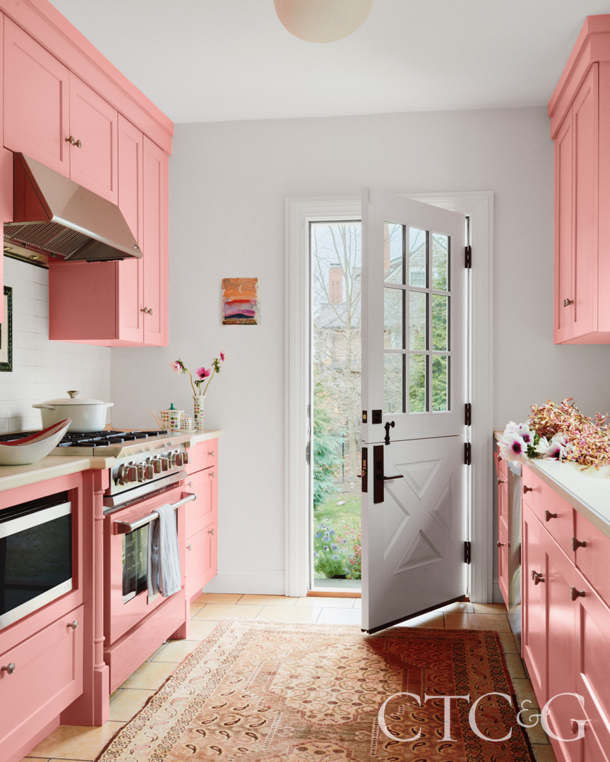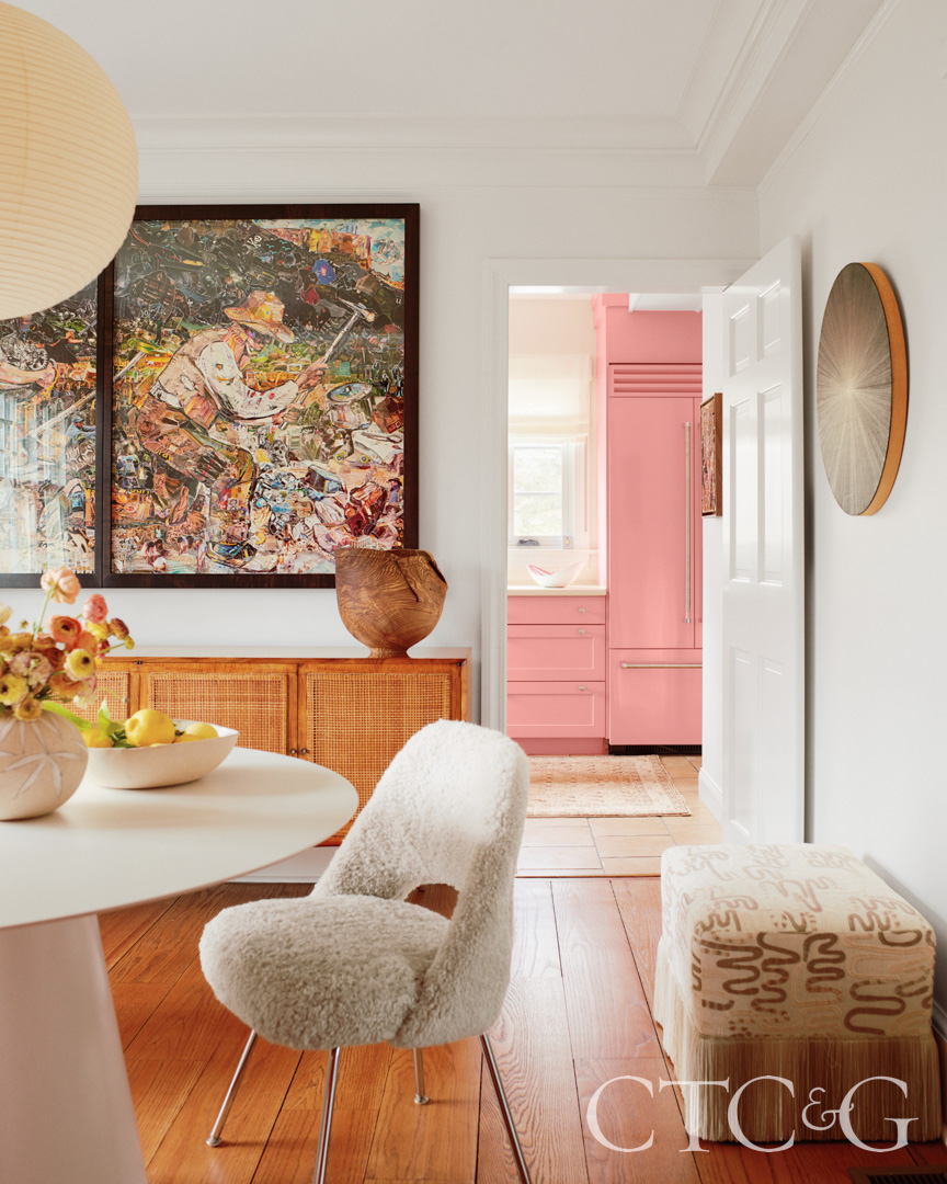 The kitchen was in desperate need of an update. “We didn’t want to make any renovations that would have looked strange in the context of the layering that was going on in the rest of the house,” says Lonstein. His solution—a playful use of pink—from the cabinets to the appliances. “It was a great way of turning a boring country kitchen into something really cool.”