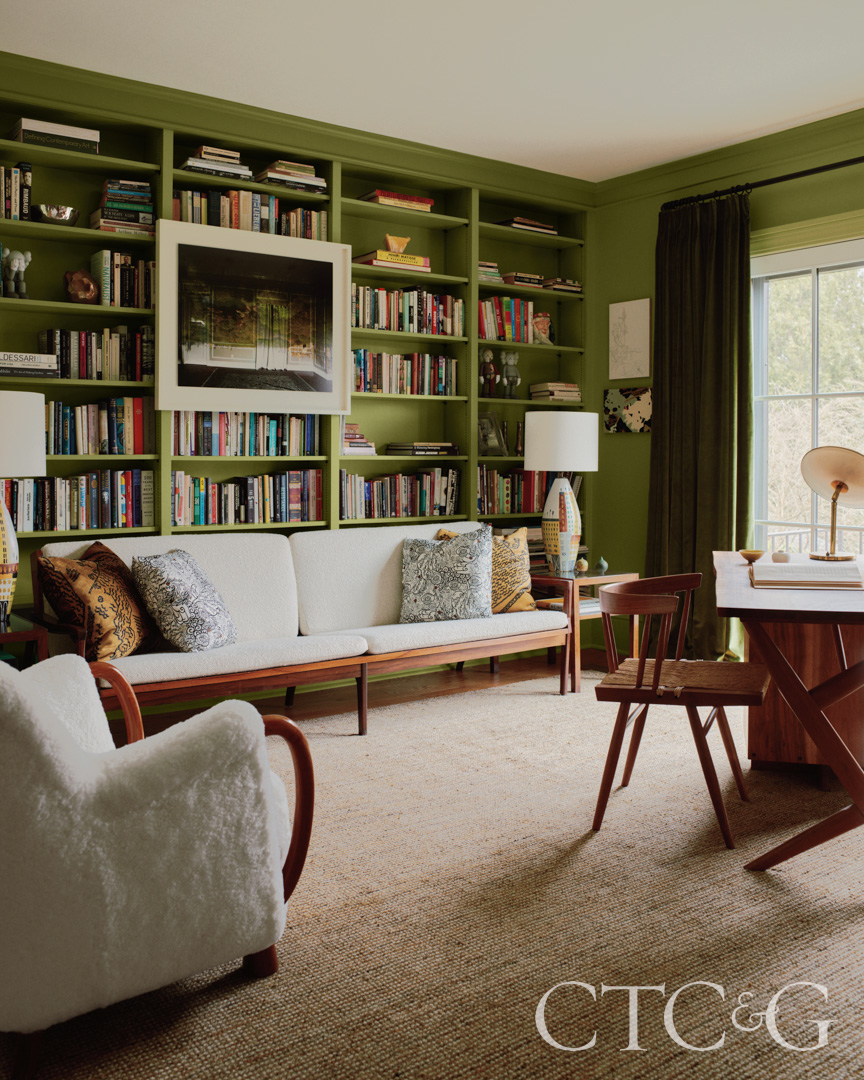 The tone turns earthier in the library where the walls are painted a deep moss green. “Besides being one of my favorite colors, it’s a tradition to have a green library, and I loved the idea of a green velvet drapery,” Lonstein says about the Pierre Frey fabric that frames the windows. For the small round bar room formed by the turret, he notched the green up to a deeper olive, where the contrast of the light upholstered furniture feels crisp and modern.