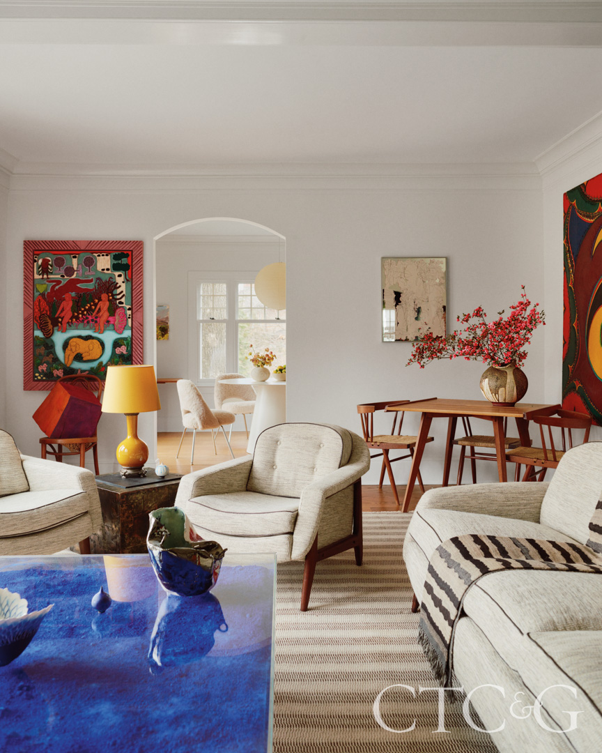 A few years after the pandemic, one of Clive Lonstein’s New York City clients asked him to take on a new project—redoing the interiors of a late-19th-century Colonial Revival in Litchfield County. The couple’s vision for the house, which was originally designed by architect Ehrick Rossiter, was simple—create a warm and welcoming country home that showcased their collection of contemporary art. They also wanted to incorporate furniture and accessories they’d collected over the years. The only caveat? The homeowners did not want to change the original architecture, which included many quirky details, including a turret.
