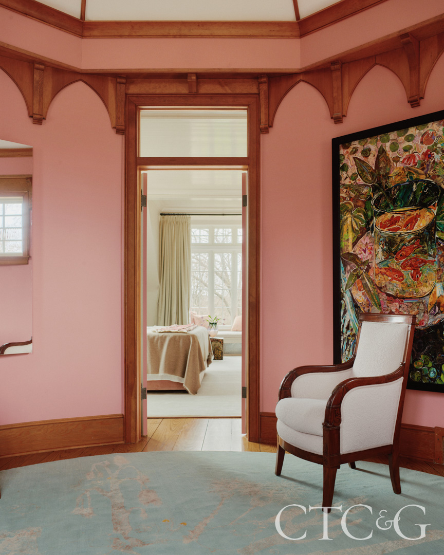 In the upstairs guestroom, a purple and orange print of the Glass House by James Welling seems to shimmer against the blue wall. The primary bedroom exudes a touch of Hollywood glamour with its pink mohair headboard and Fortuny fabric throw pillows. The adjacent round sitting room—part of the turret—has a seductive vibe with its wash of dusty rose, which perfectly complements the original detailing on the walls.