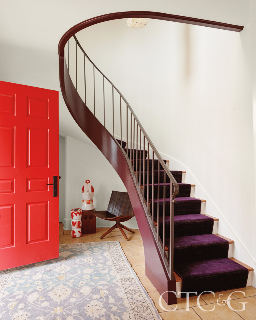 The first inkling of what’s in store is the entry foyer, where a bright-red front door opens to reveal an aubergine staircase, a hue Lonstein calls “sophisticated and practical.” The color story continues in the living room with its blue Yves Klein coffee table. Against one wall, a sculpture by Sarah Braman features a chair that appears to have a red cube falling through it. With the addition of a yellow antique lamp on a side table, “the effect is like a Mondrian painting,” he says.